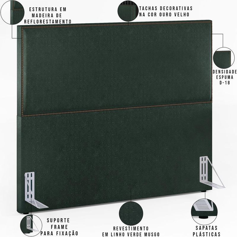 A Cabeceira Para Cama Box Vicenza é a peça que vai trazer toda elegância para o seu quarto! Todos os detalhes dela foram pensados para criar uma sensação de aconchego e tranquilidade para os momentos de conforto! Valoriza seu ambiente, além de dispor de toda harmonia que o seu cantinho de paz precisa! Além do destaque para as tachas decorativas, toda a qualidade envolvendo ela pode te surpreender em composição com mesas de cabeceira, e objetos decorativos! Todos os detalhes fazem a diferença! Seus momentos de descanso serão muito mais agradáveis com a Cabeceira Vicenza! Leve toda qualidade e elegância pra dentro da sua casa! Dimensões do produto (L x A x P) 140 x 127 x 8 cm Altura do chão á base: 66 cm Diâmetro da tacha decorativa: 9,5 mm Dimensões do suporte frame (L x A x P) 5,5 x 13,5 x 16,5 cm Características: Estrutura em madeira reflorestada. Revestimento em tecido Linho Verde Musgo. Acabamento em fita de tachas de ferro galvanizado, na cor ouro velho. Densidade da Espuma D-18. Acompanha todos os acessórios para fixação. Acompanha suporte frame produzido em chapa de ferro com acabamento em esmalte PU na cor alumínio. Possui sapatas plásticas. - Por se tratar de estofado as medidas podem ter uma pequena variação de até 3 cm. - A tonalidade do produto real poderá ter ligeira variação devido o lote de tecidos. Observações importantes: - Produto para uso residencial em ambiente interno, não devendo ficar exposto diretamente ao sol, calor e umidade excessivos. - Pode haver alguma diferença de tonalidade entre a imagem e o produto real, por conta do tratamento de imagens e a calibração de cores do seu monitor. - As imagens são meramente ilustrativas, não acompanham objetos de decoração e eletrônicos. - Ao receber a mercadoria, o cliente deve verificar as condições da embalagem, caso haja alguma avaria não assine o comprovante de recebimento. - Montagem, desmontagem e outras instalações serão de responsabilidade do cliente. Não nos responsabilizamos, no ato da entrega, por subir escadas/elevadores ou pelo transporte por guincho em apartamentos. Eventuais despesas são de responsabilidade do comprador. - Confira as dimensões do produto e certifique-se de que passará normalmente por supostos elevadores, portas, escadas e/ou corredores de sua residência.