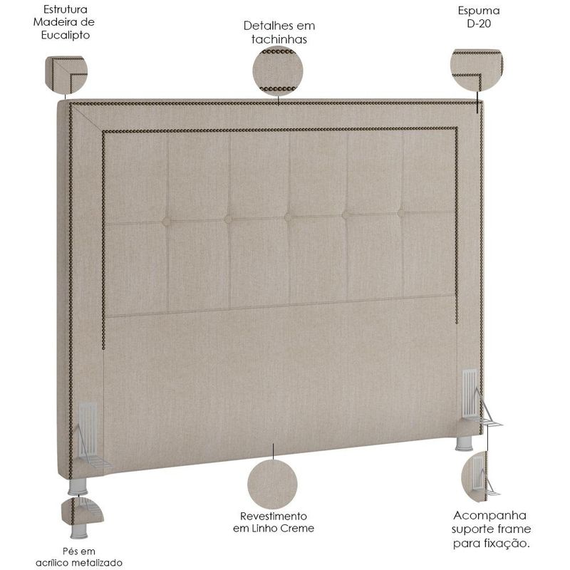 A Cabeceira Cama Box Casal Queen 160 cm P05 Atenas Linho Creme - Lyam Decor é uma peça singular e elegante. Com design moderno, ela traz destaque e beleza na hora de compor seu quarto. Seus detalhes em tachas, denotam todo o cuidado e carinho na hora da produção. Uma cabeceira que trás presença, beleza e originalidade aos apreciadores do minimalismo, agregando valor aos pequenos detalhes. Com materiais de excelente qualidade e acabamento impecável, o revestimento em Linho combina majestosamente com o restante da mobília. Podendo ser disposta com mesas de cabeceira e apoio, calçadeira ou recamier. É a composição perfeita para os amantes da elegância! Você merece o melhor, garanta já a sua!! Dimensões da Cabeceira (L x A x P) 160 x 128 x 10 cm Características da Cabeceira: Estrutura em madeira de eucalipto. Revestimento em tecido Linho na cor Creme. Densidade da Espuma D-20. Acompanha suporte frame para fixação. Pés em Acrilíco Metalizado. Botonê revestido. Contorno com tachinhas. - Por se tratar de estofado as medidas podem ter uma pequena variação de até 3 cm. - A tonalidade do produto real poderá ter ligeira variação devido o lote de tecidos. - A limpeza deve ser feita com pano levemente umedecido em água limpa, sem esfregar, não utilizar produtos abrasivos, desengordurantes, álcool ou solvente. Observações importantes: - Produto para uso residencial em ambiente interno, não devendo ficar exposto diretamente ao sol, calor e umidade excessivos. - Pode haver alguma diferença de tonalidade entre a imagem e o produto real, por conta do tratamento de imagens e a calibração de cores do seu monitor. - As imagens são meramente ilustrativas, não acompanham objetos de decoração e eletrônicos. - Ao receber a mercadoria, o cliente deve verificar as condições da embalagem, caso haja alguma avaria não assine o comprovante de recebimento. - Montagem, desmontagem e outras instalações serão de responsabilidade do cliente. Não nos responsabilizamos, no ato da entrega, por subir escadas/elevadores ou pelo transporte por guincho em apartamentos. Eventuais despesas são de responsabilidade do comprador. - Confira as dimensões do produto e certifique-se de que passará normalmente por supostos elevadores, portas, escadas e/ou corredores de sua residência.