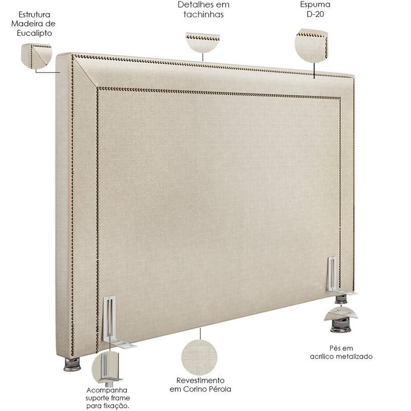 A Cabeceira Cama Box Casal Queen 160 cm P05 Berlim Corino Pérola - Lyam Decor é uma peça singular e elegante. Com design moderno, ela traz destaque e beleza na hora de compor seu quarto. Seus detalhes em tachas, denotam todo o cuidado e carinho na hora da produção. Uma cabeceira que trás presença, beleza e originalidade aos apreciadores do minimalismo, agregando valor aos pequenos detalhes. Com materiais de excelente qualidade e acabamento impecável, o revestimento em Corino combina majestosamente com o restante da mobília. Podendo ser disposta com mesas de cabeceira e apoio, calçadeira ou recamier. É a composição perfeita para os amantes da elegância! Você merece o melhor, garanta já a sua!! Dimensões da Cabeceira (L x A x P) 160 x 128 x 10 cm Características da Cabeceira: Estrutura em madeira de eucalipto. Revestimento em tecido Corino na cor Pérola. Densidade da Espuma D-20. Acompanha suporte frame para fixação. Pés em Acrilíco Metalizado. Contorno com tachinhas. - Por se tratar de estofado as medidas podem ter uma pequena variação de até 3 cm. - A tonalidade do produto real poderá ter ligeira variação devido o lote de tecidos. - A limpeza deve ser feita com pano levemente umedecido em água limpa, sem esfregar, não utilizar produtos abrasivos, desengordurantes, álcool ou solvente. Observações importantes: - Produto para uso residencial em ambiente interno, não devendo ficar exposto diretamente ao sol, calor e umidade excessivos. - Pode haver alguma diferença de tonalidade entre a imagem e o produto real, por conta do tratamento de imagens e a calibração de cores do seu monitor. - As imagens são meramente ilustrativas, não acompanham objetos de decoração e eletrônicos. - Ao receber a mercadoria, o cliente deve verificar as condições da embalagem, caso haja alguma avaria não assine o comprovante de recebimento. - Montagem, desmontagem e outras instalações serão de responsabilidade do cliente. Não nos responsabilizamos, no ato da entrega, por subir escadas/elevadores ou pelo transporte por guincho em apartamentos. Eventuais despesas são de responsabilidade do comprador. - Confira as dimensões do produto e certifique-se de que passará normalmente por supostos elevadores, portas, escadas e/ou corredores de sua residência.