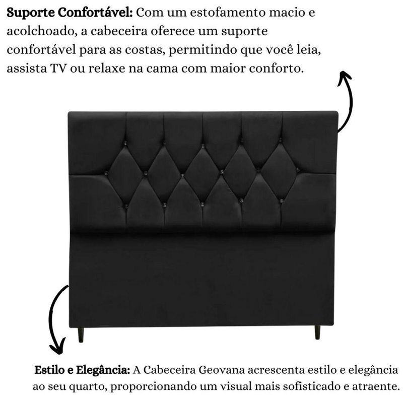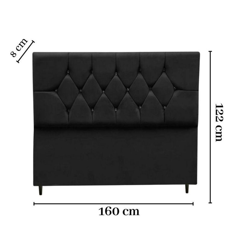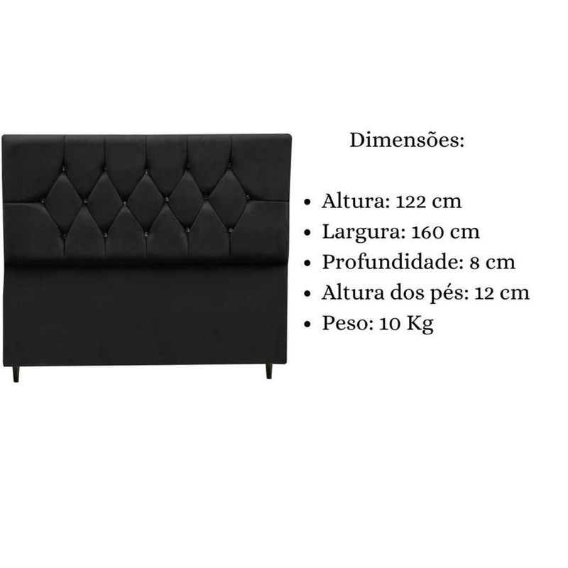 Cabeceira Cama Box Estofada Queen 160 Cm Geovana Suede PretoApresentamos a deslumbrante Cabeceira Cama Box Estofada Queen 160 cm Geovana Suede, disponível para venda em um padrão exclusivo! Esta cabeceira é a combinação perfeita de elegância, conforto e estilo para o seu quarto.Dimensões:Altura: 122 cmLargura: 160 cmProfundidade: 8 cmAltura dos pés: 12 cmPeso: 10 KgCom dimensões imponentes, possui uma altura de 122 cm que cria uma presença marcante e luxuosa no ambiente. A largura de 160 cm oferece uma cobertura ideal para camas queen size, garantindo um visual harmonioso e sofisticado. Com apenas 8 cm de profundidade, a cabeceira se encaixa perfeitamente na estrutura da cama, proporcionando um acabamento impecável.O estofamento em suede é um convite ao toque suave e aconchegante. A cor e textura do suede proporcionam uma sensação de conforto e agradabilidade, tornando-se o lugar perfeito para apoiar-se enquanto lê um livro ou assiste a um filme relaxante.Os detalhes em capitonê com strass são o elemento de destaque dessa cabeceira. Os botões delicados com strass são cuidadosamente dispostos em uma padronagem de capitonê, acrescentando um toque de glamour e sofisticação. Esses detalhes decorativos conferem um brilho sutil e elegante, transformando a cabeceira em uma peça única e especial.A cabeceira também conta com pés com altura de 12 cm, que oferecem estabilidade e segurança para a estrutura. Apesar de seu visual impressionante, a cabeceira tem um peso leve de apenas 10 kg, o que facilita sua movimentação e ajuste conforme necessário.A Cabeceira Cama Box Estofada Queen 160 cm Geovana Suede, com seus detalhes em capitonê strass, é a escolha perfeita para quem busca adicionar estilo, conforto e um toque de luxo ao quarto. Seu design impecável, aliado aos materiais de alta qualidade, proporciona uma experiência excepcional de descanso e transforma seu quarto em um ambiente acolhedor e elegante. Aproveite essa oportunidade única e adquira essa peça deslumbrante para o seu quarto agora mesmo!Especificações do ProdutoEstrutura: Madeira EucaliptoTecido: SuedeMaterial dos pés: Madeira EucaliptoBotões: StrassInstalação: Não acompanha kit frame para fixação na cama box, o produto ficará apoiado entre a cama e paredeGarantia: 90 dias contra defeito de fabricaçãoMontagem: O produto vai montado, necessitando apenas rosquear os pés (2)Instruções de Limpeza: Utilizar um pano limpo e levemente úmidoVocê irá receber: 01 volumeObservações RelevantesProduto para uso residencial em ambiente interno, não devendo ficar exposto diretamente ao sol, calor e umidades excessivas.Pode haver alguma diferença de tonalidade entre a imagem e o produto real, por conta do tratamento de imagens e a calibração de cores do seu monitor.Para futuras compras, não garantimos a mesma tonalidade de cor, pois existe variação a cada lote do fabricante do tecido.As imagens são meramente ilustrativas, não acompanham objetos de decoração e eletros.Confira as dimensões do produto no momento da compra e certifique-se de que passará normalmente por escadas, elevadores, portas e corredores.Cabeceira Estofada Queen 160 cm Geovana Suede: Elegância e Conforto em um Só Produto!Transforme Seu Quarto com a Cabeceira Estofada Queen 160 cm Geovana SuedeAdicione Sofisticação com a Cabeceira Estofada Queen 160 cm Geovana SuedeCabeceira Queen 160 cm Geovana Suede: Estilo e Conforto ao Seu AlcanceValorize Seu Quarto com a Cabeceira Estofada Queen 160 cm Geovana SuedeCabeceira Cama Box Queen 160 cm Geovana Suede: Toque de Luxo para o Seu QuartoEleve o Visual do Seu Quarto com a Cabeceira Estofada Queen 160 cm Geovana SuedeCabeceira Queen 160 cm Geovana Suede: O Detalhe que Faz a DiferençaSua Nova Cabeceira Estofada: Queen 160 cm Geovana SuedeCabeceira Estofada Queen 160 cm Geovana Suede: Conforto e Estilo em Um Único ProdutoA Cabeceira Perfeita para Sua Cama Queen: 160 cm Geovana SuedeSofisticação e Elegância com a Cabeceira Estofada Queen 160 cm Geovana SuedeRealce Seu Quarto com a Cabeceira Queen 160 cm Geovana SuedeCabeceira Estofada Queen 160 cm Geovana Suede: O Toque Final para Seu QuartoAdorne Seu Quarto com a Cabeceira Queen 160 cm Geovana Suede