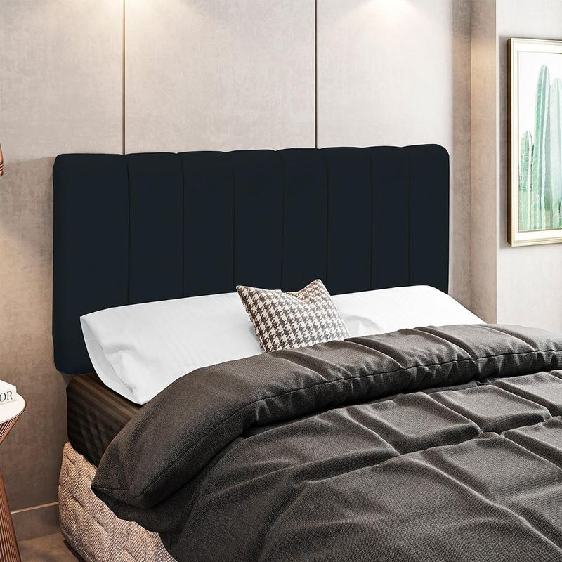 Descrição do produto: A Cabeceira Para Cama Box Estofada é um dos principais componentes versáteis e charmosos para o quarto de Casal. Cria o aspecto luxuoso e e super funcional ao quarto, imagina só o conforto, é encostar e relaxar! Seus momentos de descanso serão muito mais agradáveis e especiais com essa peça incrível na decoração do seu quarto. Outra dica, é que quando combinada com outros componentes de decoração dá um show! Assim como combinar com papel de parede, luminárias, mesas de cabeceira e objetos decorativos que podem ficar sobre ela. Demais né? :) Dimensões do produto (L x A x P) 140 x 63 x 9 cm Características: Estrutura em madeira reflorestada. Revestimento em tecido Suede Preto. Densidade da Espuma D-18. Acompanha todos os acessórios para fixação. - Por se tratar de estofado as medidas podem ter uma pequena variação de até 3 cm. - A tonalidade do produto real poderá ter ligeira variação devido o lote de tecidos. Observações importantes: - Produto para uso residencial em ambiente interno, não devendo ficar exposto diretamente ao sol, calor e umidade excessivos. - Pode haver alguma diferença de tonalidade entre a imagem e o produto real, por conta do tratamento de imagens e a calibração de cores do seu monitor. - As imagens são meramente ilustrativas, não acompanham objetos de decoração e eletrônicos. - Ao receber a mercadoria, o cliente deve verificar as condições da embalagem, caso haja alguma avaria não assine o comprovante de recebimento. - Montagem, desmontagem e outras instalações serão de responsabilidade do cliente. Não nos responsabilizamos, no ato da entrega, por subir escadas/elevadores ou pelo transporte por guincho em apartamentos. Eventuais despesas são de responsabilidade do comprador. - Confira as dimensões do produto e certifique-se de que passará normalmente por supostos elevadores, portas, escadas e/ou corredores de sua residência.