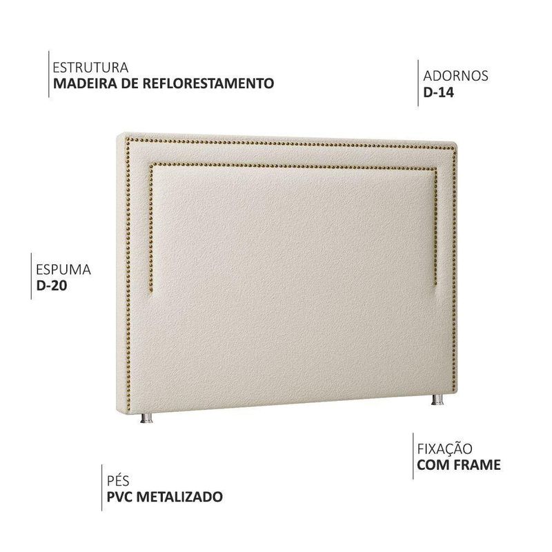 Cabeceira Cama Box Queen 160 Cm London Bouclé Off White - Nexta CasaCabeceira London – conforto, beleza e qualidade em cada centímetro.Ideal para quem busca um quarto bem decorado sem abrir mão da funcionalidade!Descrição do ProdutoFabricada com estrutura reforçada e espuma de alta densidade, a cabeceira London alia resistência e estilo. O estofamento em espuma D-20 assegura conforto ao encostar, e o acabamento com tachas dá um toque de personalidade. Minimalista, mas marcante, é o tipo de peça que eleva o padrão do quarto. Feita para quem não abre mão de estilo com qualidade superior. O toque final para sua decoração, é o tipo de cabeceira que muda tudo, transforma seu espaço em um verdadeiro ambiente de revista. Você merece o melhor, garanta já a sua!Características Técnicas Estrutura: Madeira de reflorestamento (pinus, eucaliptos e placas de MDF) com imunização contra mofo, cupim e micro-organismos. Material do Enchimento: D-20. Revestimento: Bouclé Pés: PVC metalizado. Possui Frame: Sim. É adequado para cama box: sim.Medidas Altura Total: 128 cm Largura: 160 cm Profundidade: 10 cm Pés: 6 cm Peso: 15 kgDiferenciais Design moderno com tachinhas na cor fumê. com Cama Box. Ideal para colchão de casal queen 160cm. Parte traseira revestida em Kami. Quantidade de Volumes: 1. Não necessita de montagem, apenas a fixação do frame!Cuidados Utilizar um pano levemente umedecido com água, seguido de pano seco. Evitar exposição ao sol para preservar a cor vibrante do tecido. Não usar produtos abrasivos ou escovas.Garantia 3 meses contra de fabricação.Observações A tonalidade da cor pode variar de acordo com o lote do fabricante. Imagens ilustrativas; tonalidade pode variar devido à configuração de cores da tela. Objetos de decoração não inclusos. Produtos enviados embalados com , reduzindo riscos de danos. Verificar as condições da embalagem na e reportar danos no . até a porta de entrada ou portaria. Confirme as dimensões e compatibilidade do de instalação. Não nos responsabilizamos por montagem, desmontagem, instalação ou por escadas/elevadores.