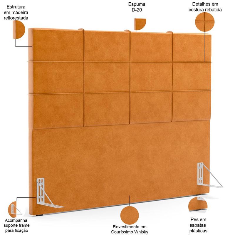 A deslumbrante Cabeceira Roma chegou para trazer a comodidade essencial para suas horas de descanso, além disso é um elemento de destaque para qualquer cama, proporcionando não apenas conforto mas também toques de elegância e requinte ao ambiente. Traz consigo um design meticuloso, feita com materiais de alta qualidade, confere um aspecto sofisticado e agradável ao toque, agregando uma textura suave ao ambiente. Vale ressaltar seus detalhes em costura rebatida que trazem o acabamento impecável, sendo assim uma peça de arte que eleva o charme do seu quarto. Seja lendo, assistindo TV ou simplesmente descansando, a superfície estofada lhe proporciona um conforto excepcional! Uma declaração de bom gosto que transforma o seu quarto em um retiro de elegância e serenidade. Garanta já a sua! Dimensões da Cabeceira (L x A x P) 160 x 120 x 8 cm Altura do chão à base: 55 cm Dimensões do Frame (L x A x P) 5,5 x 13,5 x 16,5 cm Características da Cabeceira: Estrutura em Madeira reflorestada. Revestimento em Couríssimo na cor Whisky, com acabamento semi brilho. Estofada com Espuma D-20. Acompanha todos os acessórios para fixação. Pés em sapatas plásticas. Características do Frame: Produzido em chapa de ferro 1,5 mm. Acabamento em esmalte PU na cor Alumínio. Acessórios para fixação: 04 Parafusos cabeça chata auto atarraxantes 5,0x25mm e 04 arruelas 1/4. - Por se tratar de estofado as medidas podem ter uma pequena variação de até 3 cm. - A tonalidade do produto real poderá ter ligeira variação devido o lote de tecidos. - A limpeza deve ser feita com pano levemente umedecido em água limpa, sem esfregar, não utilizar produtos abrasivos, desengordurantes, álcool ou solvente. Observações importantes: - Produto para uso residencial em ambiente interno, não devendo ficar exposto diretamente ao sol, calor e umidade excessivos. - Pode haver alguma diferença de tonalidade entre a imagem e o produto real, por conta do tratamento de imagens e a calibração de cores do seu monitor. - As imagens são meramente ilustrativas, não acompanham objetos de decoração e eletrônicos. - Ao receber a mercadoria, o cliente deve verificar as condições da embalagem, caso haja alguma avaria não assine o comprovante de recebimento. - Montagem, desmontagem e outras instalações serão de responsabilidade do cliente. Não nos responsabilizamos, no ato da entrega, por subir escadas/elevadores ou pelo transporte por guincho em apartamentos. Eventuais despesas são de responsabilidade do comprador. - Confira as dimensões do produto e certifique-se de que passará normalmente por supostos elevadores, portas, escadas e/ou corredores de sua residência.