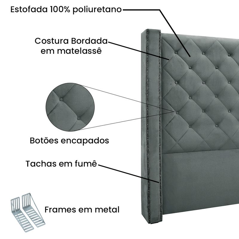 Dormir bem e manter-se seguro na hora de relaxar são fatores importantes que influenciam na qualidade do sono. Unir esses pontos com uma decoração incrível seria perfeito, não é mesmo? Que tal começar essa mudança pela cabeceira da sua cama!? A Cabeceira Vicenza sem dúvida vai roubar a cena de tão linda e aconchegante! Contém estrutura feita em madeira de eucalipto, uma opção que ressalta a durabilidade e beleza da peça. A cabeceira é preenchida com espuma D23, garantindo um conforto ideal para noites mais tranquilas. Este modelo é indicado para Cama Box Solteiro de 90 cm, possui costura em losangos bordada em matelassê, tachas em fumê e botões encapados que conferem uma textura maleável e um visual refinado. O revestimento foi feito no Veludo, um tecido de alta qualidade no tom Cinza perfeita para criar uma atmosfera mais aconchegante ao local. As sapata são de plástico além de serem muito resistentes garantem maior flexibilidade e sustentação à peça. E não menos importante acompanha frame em metal que é o suporte ideal para fixar a cabeceira na cama box. O design desta peça apresenta um elemento estético sofisticado, que transformará instantaneamente o ambiente e impedirá que a passagem de temperaturas (frio/quente) que se concentram na parede, passem diretamente para o usuário. A Cabeceira Vicenza é a opção mais adequada para o seu dormitório, afinal de contas você merece o que há de melhor para completar a decoração da sua casa. Adquira a Cabeceira Vicenza antes que acabe o estoque! Dimensões da Cabeceira: Altura total: 138 cm Largura total: 114 cm Profundidade total: 19 cm Largura Interna: 90 cm Largura das abas: 12 cm Peso: 14 kg Especificações do Produto Estrutura: Madeira Eucalipto Reflorestada Material e Densidade da Espuma: 100% Poliuretano / D-23 Tecido: Veludo Tipo de pés: Sapatas Plasticas PVC Possui Frame: Sim Diferenciais: Botões Emcapados, Costura Bordada em Matelasse, Tachas em Fumê Recomendado: Cama Box Solteiro Montagem: O produto é enviado montado, sendo necessário apenas a fixação do frame Acessórios: Manual de montagem e kit frame e parafusos p/ cama box Complexidade da Montagem: Baixa Garantia: 90 dias contra defeito de fabricação Instruções de limpeza: Utilizar um pano limpo e levemente úmido Você irá receber: 01 Cabeceira Entregue em: 01 Volume