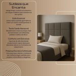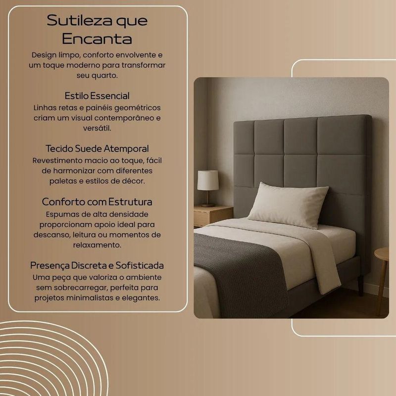 Cabeceira Cama Box Solteiro 90cm Elena Estofada Preto Elena: A Cabeceira que Transforma o Quarto em um Refúgio de PersonalidadeHá peças que não passam despercebidas. A Cabeceira Elena é uma delas. Com seu revestimento macio e aparência marcante, ela não apenas complementa a cama – ela comanda o ambiente. Ideal para quem busca imprimir sofisticação e estilo ao décor, Elena convida o olhar e o toque, criando uma atmosfera de puro aconchego visual e sensorial.Seu design geométrico, com módulos simétricos, remete ao estilo Contemporâneo, valorizando linhas retas e a força dos volumes. Perfeita para ambientes modernos com alma criativa, ela harmoniza-se tanto com paletas neutras quanto com composições mais arrojadas, sendo a protagonista de uma decoração autêntica.Imagine essa peça em contraste com paredes claras, iluminação indireta e texturas naturais – o resultado é um quarto com personalidade, elegância e calor emocional. O acabamento suave acrescenta uma camada de conforto e sofisticação tátil, despertando os sentidos e convidando ao relaxamento.Mais do que um móvel, Elena é uma declaração de estilo. Ideal para quem não tem medo de transformar o quarto em um espaço de expressão pessoal, onde cada detalhe reflete quem você é.ESPECIFICAÇÕESEstrutura: Madeira de Eucalipto Reflorestada;Espuma: D-23;Modelo dos Pés: pés em material polímero de alta resistência ;Grampos: de aço galvanizados;Revestimento: Tecido Suede;DIMENSÕES DA CABECEIRAAltura total: 126cm;Largura total: 90cm;Profundidade total: 12cm;Pés: 12cm;Peso: 17kg;EXCELÊNCIA EM CADA DETALHENa Divani, qualidade não é promessa — é prática diária. Por isso, cada móvel passa por testes rigorosos que avaliam desde a estrutura em madeira até a precisão da costura e o acabamento da tapeçaria. Mas, mesmo com todo esse cuidado, sabemos que imprevistos podem acontecer. Se dentro de 90 dias após a entrega você identificar algum defeito de fabricação ou dano ocasionado no transporte, nossa equipe de suporte está pronta para atender você com empatia, agilidade e eficiência. Garantimos não apenas um produto de alto padrão, mas também um pós-venda humano, dedicado a manter sua experiência Divani à altura do que ela merece ser: impecável.SOBRE A DIVANINascida em Arapongas, o coração pulsante do maior polo moveleiro do Sul do Brasil, a Divani é fruto de uma história familiar movida pela paixão por design e sofisticação. Em meio a um cenário onde a excelência da matéria-prima encontra o talento de uma mão de obra altamente qualificada, criamos mais do que móveis: entregamos experiências. Cada peça carrega o compromisso com o conforto, a estética refinada e o desejo genuíno de transformar ambientes em refúgios de bem-estar. Acreditamos que o lar é uma extensão da alma – e é por isso que, desde a origem, cultivamos o cuidado artesanal e o olhar atento às tendências internacionais. Divani é onde o requinte encontra propósito, e o design ganha calor humano.CUIDADOS COM A LIMPEZAUtilizar um pano limpo e seco. Não limpar com produtos abrasivos ou escovas. Não deixar exposta à luz do sol diretamente pois isso irá diminuir a vida útil do produto, fazendo-o envelhecer precocemente. Este produto não é recomendado para ambientes externos onde possa receber chuva.MONTAGEMNivel de montagem simples .Na parte de trás da cabeceira abrir o forro para retirar os pés e realizar a junção da cabeceira no box.Necessita rosquear os pés.INFORMAÇÕES IMPORTANTES- Todos os produtos vão embalados com total segurança;- A entrega do produto é realizada em todo território nacional, até onde as rodovias alcançam, entregas fluviais ou aéreas devem ser cotadas à parte;- Objetos decorativos que aparecem na foto não acompanham o produto;- Pode haver alguma diferença de tonalidade entre a imagem e o produto real, por conta do tratamento de imagens e a calibração de cores do seu monitor;- Por se tratar de estofado as medidas podem ter uma pequena variação em até 3 cm;- Confira as dimensões do produto e certifique-se de que passará normalmente por supostos elevadores, portas, escadas e/ou corredores de sua residência, já que nossa entrega não inclui a subida de lances de escada, ou o lançamento de produtos;- Ao receber a mercadoria, o cliente deve verificar as condições da embalagem, caso haja alguma avaria não assine o comprovante de recebimento;- Observando as orientações acima, evita-se futuros desagrados ou imprevistos com a entrega do produto. Havendo despesas adicionais, serão de responsabilidade do cliente.