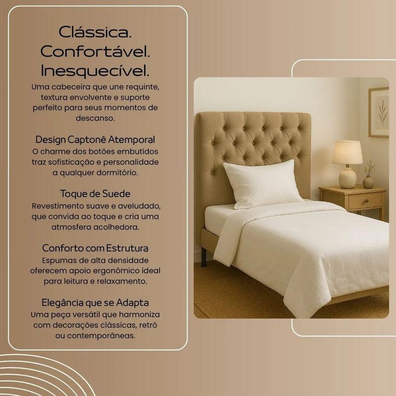 Cabeceira Cama Box Solteiro 90cm Valentina Estofada Cinza Valentina: O Toque de Sofisticação que Seu Quarto MereceTransforme o seu quarto em um verdadeiro refúgio de elegância com a Cabeceira Valentina, uma peça que exala charme clássico com um toque contemporâneo. Seu design estofado em capitonê, com botões delicadamente posicionados, cria um visual imponente e acolhedor, ideal para quem busca aliar estética e conforto em um só móvel.Imagine chegar em casa após um dia intenso e se recostar nessa cabeceira macia, envolto por um tecido suave e uma estrutura que convida ao descanso. Versátil e cheia de personalidade, ela se adapta com facilidade a diferentes propostas decorativas — dos ambientes mais sóbrios aos mais sofisticados.Inspirada no estilo Clássico Contemporâneo, a Valentina é perfeita para quem deseja criar um quarto com atmosfera requintada, mas sem excessos. Seu acabamento impecável e o desenho capitonê atemporal evocam a elegância dos antigos boudoirs franceses, repaginados para a vida moderna.Seja para compor uma suíte refinada ou renovar o dédo quarto de casal, a Cabeceira Valentina é aquele detalhe que transforma o ambiente, tornando-o mais acolhedor, sofisticado e inesquecível. ESPECIFICAÇÕESEstrutura: Madeira de Eucalipto Reflorestada;Espuma: D-23;Modelo dos Pés: pés em material polímero de alta resistência ;Grampos: de aço galvanizados;Revestimento: Tecido Suede;DIMENSÕES DA CABECEIRAAltura total: 127cm;Largura total: 90cm;Profundidade total: 9cm;Pés: 12cm;Peso: 17kg;EXCELÊNCIA EM CADA DETALHENa Divani, qualidade não é promessa — é prática diária. Por isso, cada móvel passa por testes rigorosos que avaliam desde a estrutura em madeira até a precisão da costura e o acabamento da tapeçaria. Mas, mesmo com todo esse cuidado, sabemos que imprevistos podem acontecer. Se dentro de 90 dias após a entrega você identificar algum defeito de fabricação ou dano ocasionado no transporte, nossa equipe de suporte está pronta para atender você com empatia, agilidade e eficiência. Garantimos não apenas um produto de alto padrão, mas também um pós-venda humano, dedicado a manter sua experiência Divani à altura do que ela merece ser: impecável.SOBRE A DIVANINascida em Arapongas, o coração pulsante do maior polo moveleiro do Sul do Brasil, a Divani é fruto de uma história familiar movida pela paixão por design e sofisticação. Em meio a um cenário onde a excelência da matéria-prima encontra o talento de uma mão de obra altamente qualificada, criamos mais do que móveis: entregamos experiências. Cada peça carrega o compromisso com o conforto, a estética refinada e o desejo genuíno de transformar ambientes em refúgios de bem-estar. Acreditamos que o lar é uma extensão da alma – e é por isso que, desde a origem, cultivamos o cuidado artesanal e o olhar atento às tendências internacionais. Divani é onde o requinte encontra propósito, e o design ganha calor humano.CUIDADOS COM A LIMPEZAUtilizar um pano limpo e seco. Não limpar com produtos abrasivos ou escovas. Não deixar exposta à luz do sol diretamente pois isso irá diminuir a vida útil do produto, fazendo-o envelhecer precocemente. Este produto não é recomendado para ambientes externos onde possa receber chuva.MONTAGEMNivel de montagem simples .Na parte de trás da cabeceira abrir o forro para retirar os pés e realizar a junção da cabeceira no box.Necessita rosquear os pés.INFORMAÇÕES IMPORTANTES- Todos os produtos vão embalados com total segurança;- A entrega do produto é realizada em todo território nacional, até onde as rodovias alcançam, entregas fluviais ou aéreas devem ser cotadas à parte;- Objetos decorativos que aparecem na foto não acompanham o produto;- Pode haver alguma diferença de tonalidade entre a imagem e o produto real, por conta do tratamento de imagens e a calibração de cores do seu monitor;- Por se tratar de estofado as medidas podem ter uma pequena variação em até 3 cm;- Confira as dimensões do produto e certifique-se de que passará normalmente por supostos elevadores, portas, escadas e/ou corredores de sua residência, já que nossa entrega não inclui a subida de lances de escada, ou o lançamento de produtos;- Ao receber a mercadoria, o cliente deve verificar as condições da embalagem, caso haja alguma avaria não assine o comprovante de recebimento;- Observando as orientações acima, evita-se futuros desagrados ou imprevistos com a entrega do produto. Havendo despesas adicionais, serão de responsabilidade do cliente.