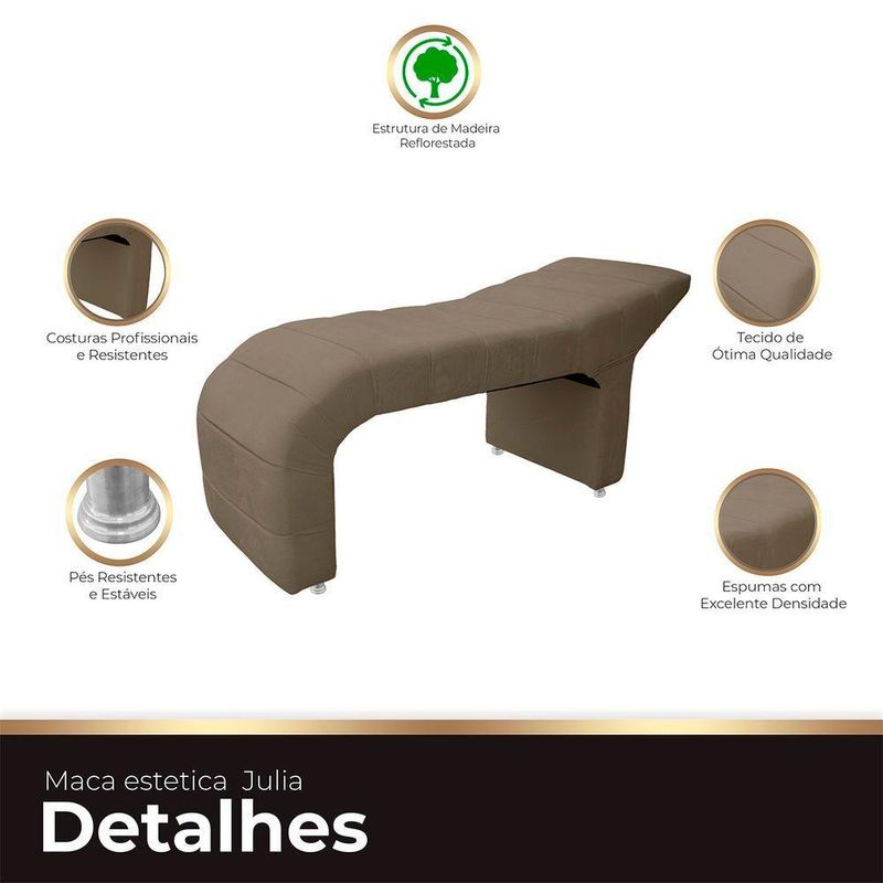 Maca Estofada Julia Para Estetica Facial Sombrancelha E Cilios Suede Cor CapuccinoEleve sua experiência estética com a Maca Estofada Julia, projetada para facilitar procedimentos de cílios e sobrancelhas. Esta peça estilosa, moderna e romântica redefine o conceito de sofisticação. Detalhes em cortes verticais proporcionam uma aparência única de gomos, adicionando um toque refinado a cada sessão. Combinando estilo e funcionalidade, a Maca Julia é a escolha perfeita para profissionais que buscam um ambiente elegante e acolhedor. Proporcione a seus clientes uma experiência estética incomparável com esta maca que transcende o convencional.ESPECIFICAÇÕESEn;Revestimento: Tecido Suede;Espuma: De alta densidade;DIMENSÕES DA MACAAltura total: 0,78cm;Largura total:1,76cm;Profundidade total: 0,67cm;Peso: 25kg.A GARANTIA É DE FÁBRICA, mas também uma garantia que reflete nossa confiança no que fazemos.Ao escolher comprar conosco, você recebe não apenas um produto excepcional, mas também a tranquilidade de saber que estamos ao seu lado. Se, por qualquer motivo, seu produto apresentar algum problema nos próximos noventa dias, como fabricantes, estamos aqui para oferecer total assistência.Nossa prioridade é garantir que sua experiência de compra seja não apenas satisfatória, mas excepcional. Queremos que você tenha a certeza de estar negociando com uma empresa que valoriza, acima de tudo, a confiança mútua com seus clientes. Sua satisfação é a nossa maior recompensa.CUIDADOS COM A LIMPEZAUtilizar um pano limpo e seco. Não limpar com produtos abrasivos ou escovas. Não deixar exposta à luz do sol diretamente pois isso irá diminuir a vida útil do produto, fazendo-o envelhecer precocemente. Este produto não é recomendado para ambientes externos onde possa receber chuva.MONTAGEM- A Maca chegará montada para você, bastando apenas colocar os pés.INFORMAÇÕES IMPORTANTES- Todos os produtos vão embalados com total segurança;-;- Objetos decorativos que aparecem na foto não acompanham o produto;- Pode haver alguma diferença de tonalidade entre a imagem e o produto real, por conta do tratamento de imagens e a calibração de cores do seu monitor;- Por se tratar de estofado as medidas podem ter uma pequena variação em até 3 cm;- Confira as dimensões do produto e certifique-se de que passará normalmente por supostos elevadores, portas, escadas e/ou corredores de sua residência, ;- Havendo despesas adicionais.