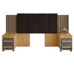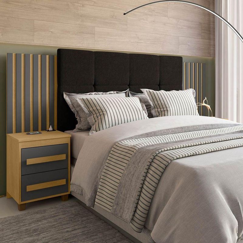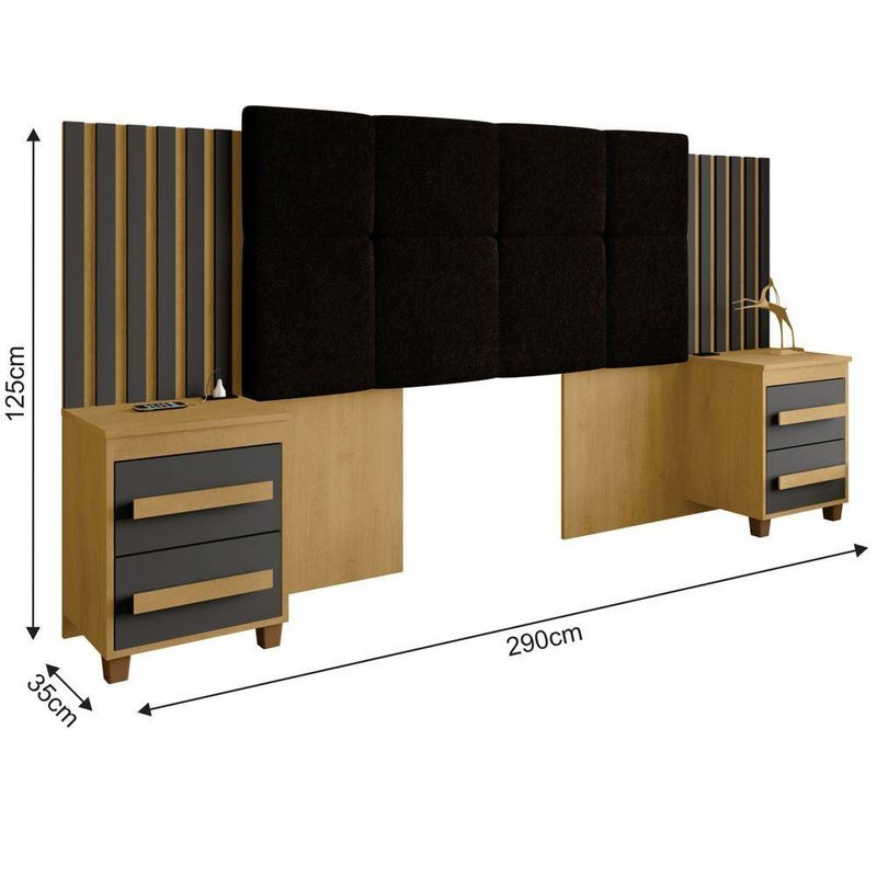 Cabeceira Casal Extensível Com 2 Mesas De Apoio Ripado E Estofado Cinamomo Com Grafite Suíça - Rv MóveisTransforme o ambiente do seu quarto com a elegante Cabeceira Extensível Suíça! Seu design contemporâneo e detalhes ripados conferem um toque de estilo refinado, perfeitamente integrado a qualquer decoração. Esta cabeceira é versátil, adaptando-se a diferentes tamanhos de box, como 1,38m, 1,58m, 1,88m e 1,98m oferecendo praticidade com suas duas mesas de cabeceira e 4 gavetas para armazenamento organizado. Os pés em PVC garantem estabilidade sem danificar o piso, enquanto os materiais de alta qualidade asseguram durabilidade e resistência ao longo do tempo. Dimensões do Produto Montado:Altura: 125 cmLargura: 290 cmProfundidade: 35 cmObservações:- Adaptável para box de 1,38, 1,58, 1,88 e 1,98m;- Criados com Corrediças telescópicas;- Ripas Autênticas- Puxadores em MDF;- 2 Tomadas inclusas;