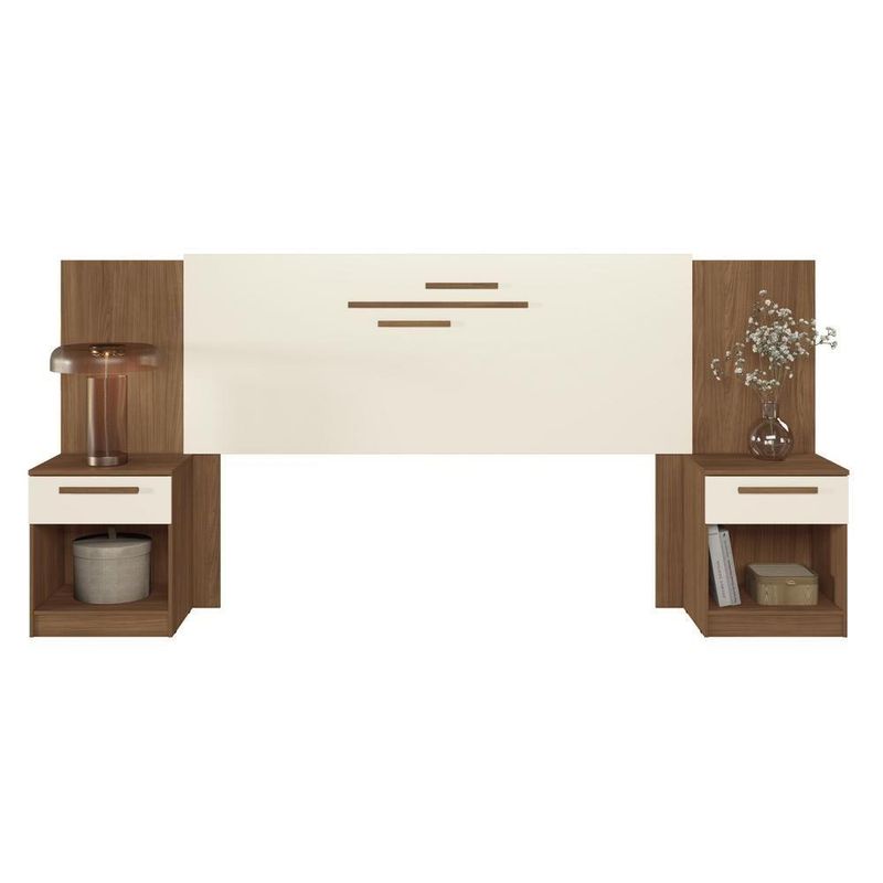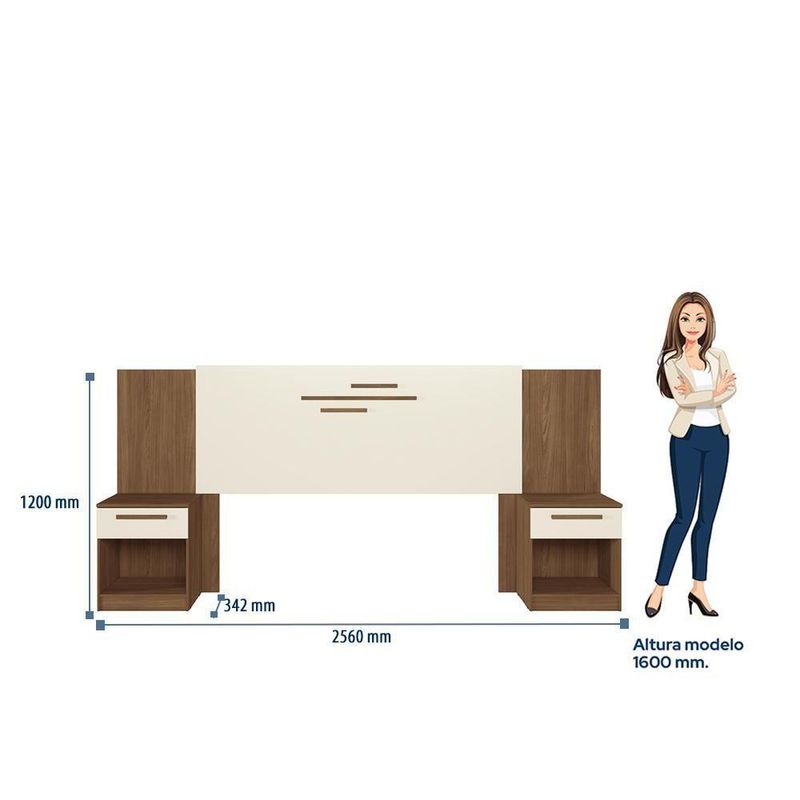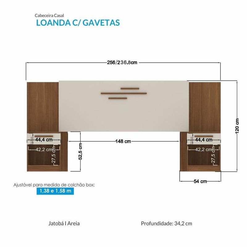 Cabeceira Casal Loanda Com Gavetas Jatobá Areia - Santos AndiráCabeceira Casal Loanda com gavetas Jatobá Areia - Santos AndiráA Cabeceira Loanda transforma seu quarto de casal em um ambiente organizado e muito mais acolhedor. Ela é fácil de montar e se ajusta perfeitamente ao seu colchão, eliminando qualquer preocupação com medidas. O grande destaque são as duas gavetas laterais, que deslizam de forma suave e oferecem o espaço perfeito para guardar o celular, livros e ter tudo o que você precisa à mão antes de dormir. Com um design elegante e charmoso, a Loanda garante que seu descanso seja mais confortável e seu quarto fique sempre impecável.Características técnicas:- Desenvolvida em MDP - Pintura em Verniz Fosco- 2 Gavetas com Corrediças Teléscopicas - Puxadores em MDF MarromDimensões:Altura: 120 cmLargura: 256 cmProfundidade: 34,2 cmInformações importantes:* Não acompanha decorações e acessórios* Nossas cargas possuem seguro, portanto, no ato da entrega, confira a quantidade de volumes recebida, e também o estado da embalagem. Se houver qualquer inconsistência, não assine o comprovante de entrega;* O armazenamento do produto no endereço de entrega é de responsabilidade do comprador. Evite apoiar o produto na vertical, bem como evite áreas que deixem o produto exposto a chuva ou umidade excessiva;* Pequenas variações de tonalidade são possíveis, em razão da diferença de resolução da tela onde o anúncio está sendo visualizado. Se notar diferença expressiva, comunicar a empresa antes de efetuar a montagem;* O serviço de entrega contratado contempla a entrega até a primeira área coberta ou portaria, não sendo coberto o ato de subir escadas/elevadores ou adentrar nas residências;* Não nos responsabilizamos pela montagem, desmontagem ou instalação do produto.
