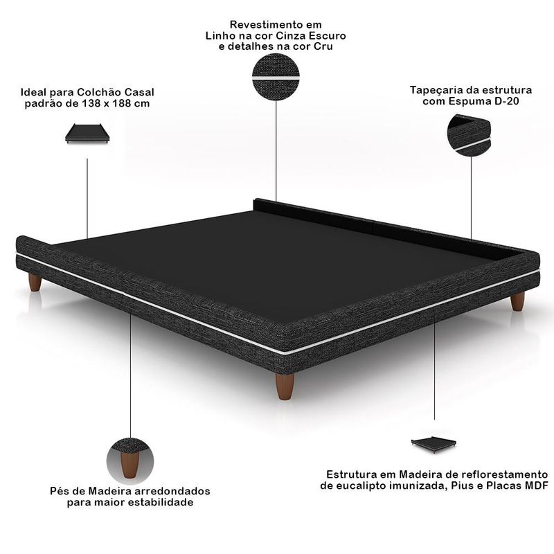 Com o conjunto de Cabeceira Casal Nilo e Cama de Casal Suném, da Lyam Decor, você terá um refúgio de sofisticação e conforto, criando um oásis de tranquilidade. As linhas elegantes da cabeceira estofada, com seus traços orgânicos e revestimento em tecido nobre, convidam para um abraço acolhedor, ao passo que base box proporciona uma sensação de conforto e segurança inigualáveis. Cada detalhe foi pensado para oferecer uma experiência única, por isso, mais do que um móvel, esse conjunto de cama estofada com cabeceira é uma obra de arte que transforma o quarto de casal em um refúgio de descanso e bom gosto. Um convite irresistível para relaxar e recarregar as energias. Dimensões da Cama (L x A x P) 148 x 28 x 193 cm Medidas Internas: Parte interna (L x A x P): 139 x 6 x 189 cm Altura dos pés: 13 cm Características da Cama: Estrutura em madeira de reflorestamento de eucalipto, pinus e placas de MDF e imunizada contra mofo, cupim e micro-organismos. Revestimento em tecido Linho de alta qualidade na cor Cinza Escuro. Pés de madeira arredondados para maior estabilidade. Tapeçada com espuma D-20. Ideal para colchão de casal padrão de 138 x 188 cm. Dimensões da Cabeceira (L x A x P) 195 x 110 x 42 cm Medidas Internas: Largura interna: 140 cm Profundidade interna inferior: 35 cm Profundidade interna superior: 24 cm Características da Cabeceira: Estrutura em madeira de reflorestamento de eucalipto, pinus e placas de MDF e imunizada contra mofo, cupim e micro-organismos. Revestimento em tecido Linho de alta qualidade na cor Cinza Escuro. Sapatas plásticas para evitar contato direto com o piso. Tapeçada com espuma D-20 e adornos com espuma D-14. Design sofisticado com abas laterais curvas. Ideal para cama casal padrão de 138cm. Acompanha par de frame. - Por se tratar de estofado as medidas podem ter uma pequena variação de até 3 cm. - A tonalidade do produto real poderá ter ligeira variação devido o lote de tecidos. - Indicado para uso residencial, sua limpeza deve ser feita com pano levemente umedecido em água limpa, sem esfregar, não utilizar produtos abrasivos, desengordurantes, álcool ou solvente. Observações importantes: - Produto para uso residencial em ambiente interno, não devendo ficar exposto diretamente ao sol, calor e umidade excessivos. - Pode haver alguma diferença de tonalidade entre a imagem e o produto real, por conta do tratamento de imagens e a calibração de cores do seu monitor. - As imagens são meramente ilustrativas, não acompanham objetos de decoração e eletrônicos. - Ao receber a mercadoria, o cliente deve verificar as condições da embalagem, caso haja alguma avaria não assine o comprovante de recebimento e entre em contato com nossa loja para orientações. - Montagem, desmontagem e outras instalações serão de responsabilidade do cliente. Não nos responsabilizamos, no ato da entrega, por subir escadas/elevadores ou pelo transporte por guincho em apartamentos. Eventuais despesas são de responsabilidade do comprador. - Confira as dimensões do produto e certifique-se de que passará normalmente por supostos elevadores, portas, escadas e/ou corredores de sua residência. - Para mais informações, acesse nossa Central de Atendimento.