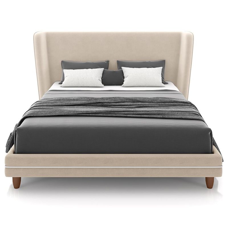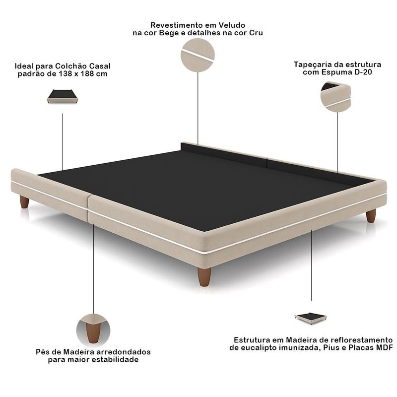 Com o conjunto de Cabeceira Casal Nilo e Cama de Casal Suném, da Lyam Decor, você terá um refúgio de sofisticação e conforto, criando um oásis de tranquilidade. As linhas elegantes da cabeceira estofada, com seus traços orgânicos e revestimento em tecido nobre, convidam para um abraço acolhedor, ao passo que base box proporciona uma sensação de conforto e segurança inigualáveis. Cada detalhe foi pensado para oferecer uma experiência única, por isso, mais do que um móvel, esse conjunto de cama estofada com cabeceira é uma obra de arte que transforma o quarto de casal em um refúgio de descanso e bom gosto. Um convite irresistível para relaxar e recarregar as energias. Dimensões da Cama (L x A x P) 148 x 28 x 193 cm Medidas Internas: Parte interna (L x A x P): 139 x 6 x 189 cm Altura dos pés: 13 cm Características da Cama: Estrutura em madeira de reflorestamento de eucalipto, pinus e placas de MDF e imunizada contra mofo, cupim e micro-organismos. Revestimento em tecido Veludo de alta qualidade na cor Bege. Pés de madeira arredondados para maior estabilidade. Tapeçada com espuma D-20. Ideal para colchão de casal padrão de 138 x 188 cm. Dimensões da Cabeceira (L x A x P) 195 x 110 x 42 cm Medidas Internas: Largura interna: 140 cm Profundidade interna inferior: 35 cm Profundidade interna superior: 24 cm Características da Cabeceira: Estrutura em madeira de reflorestamento de eucalipto, pinus e placas de MDF e imunizada contra mofo, cupim e micro-organismos. Revestimento em tecido Veludo de alta qualidade na cor Bege. Sapatas plásticas para evitar contato direto com o piso. Tapeçada com espuma D-20 e adornos com espuma D-14. Design sofisticado com abas laterais curvas. Ideal para cama casal padrão de 138cm. Acompanha par de frame. - Por se tratar de estofado as medidas podem ter uma pequena variação de até 3 cm. - A tonalidade do produto real poderá ter ligeira variação devido o lote de tecidos. - Indicado para uso residencial, sua limpeza deve ser feita com pano levemente umedecido em água limpa, sem esfregar, não utilizar produtos abrasivos, desengordurantes, álcool ou solvente. Observações importantes: - Produto para uso residencial em ambiente interno, não devendo ficar exposto diretamente ao sol, calor e umidade excessivos. - Pode haver alguma diferença de tonalidade entre a imagem e o produto real, por conta do tratamento de imagens e a calibração de cores do seu monitor. - As imagens são meramente ilustrativas, não acompanham objetos de decoração e eletrônicos. - Ao receber a mercadoria, o cliente deve verificar as condições da embalagem, caso haja alguma avaria não assine o comprovante de recebimento e entre em contato com nossa loja para orientações. - Montagem, desmontagem e outras instalações serão de responsabilidade do cliente. Não nos responsabilizamos, no ato da entrega, por subir escadas/elevadores ou pelo transporte por guincho em apartamentos. Eventuais despesas são de responsabilidade do comprador. - Confira as dimensões do produto e certifique-se de que passará normalmente por supostos elevadores, portas, escadas e/ou corredores de sua residência. - Para mais informações, acesse nossa Central de Atendimento.