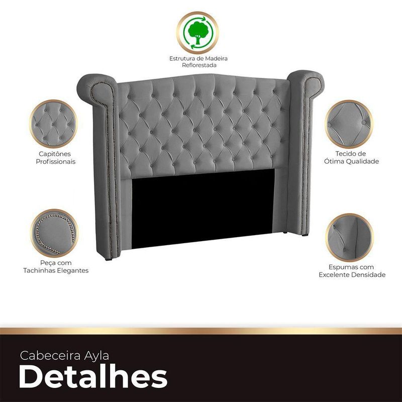 Cabeceira Casal Queen Size Estofada Para Cama Box Ayla Veludo CinzaNossa cabeceira estofada Ayla para cama box Queen Size é a chave para transformar seu quarto em um retiro de luxo. Seu design contemporâneo e elegante acrescenta um toque de romantismo e sofisticação ao ambiente. Os detalhes em tachinha de alumínio realçam a sensação de exclusividade, enquanto o aplique em MDF eleva o nível de requinte. Com botões delicadamente revestidos no tecido, na mesma cor do móvel, esta cabeceira é o toque final que você deseja. Descubra o conforto e o charme inigualáveis que apenas nossa cabeceira pode proporcionar. Torne seu quarto um verdadeiro oásis de beleza e estilo hoje mesmo!ESPECIFICAÇÕESEn;Revestimento: Tecido Veludo;Espuma: de alta densidade;DIMENSÕES DA CABECEIRAAltura total: 1,34m;Largura total: 1,85 para cama de 1,60cm;Profundidade total: 22cm;Peso: 15kg.A GARANTIA É DE FÁBRICA, mas também uma garantia que reflete nossa confiança no que fazemos.Ao escolher comprar conosco, você recebe não apenas um produto excepcional, mas também a tranquilidade de saber que estamos ao seu lado. Se, por qualquer motivo, seu produto apresentar algum problema nos próximos noventa dias, como fabricantes, estamos aqui para oferecer total assistência.Nossa prioridade é garantir que sua experiência de compra seja não apenas satisfatória, mas excepcional. Queremos que você tenha a certeza de estar negociando com uma empresa que valoriza, acima de tudo, a confiança mútua com seus clientes. Sua satisfação é a nossa maior recompensa.CUIDADOS COM A LIMPEZAUtilizar um pano limpo e seco. Não limpar com produtos abrasivos ou escovas. Não deixar exposta à luz do sol diretamente pois isso irá diminuir a vida útil do produto, fazendo-o envelhecer precocemente. Este produto não é recomendado para ambientes externos onde possa receber chuva.MONTAGEM- A Cabeceira chegará montada para você, bastando apenas colocar os pés.INFORMAÇÕES IMPORTANTES- Todos os produtos vão embalados com total segurança;-;- Objetos decorativos que aparecem na foto não acompanham o produto;- Pode haver alguma diferença de tonalidade entre a imagem e o produto real, por conta do tratamento de imagens e a calibração de cores do seu monitor;- Por se tratar de estofado as medidas podem ter uma pequena variação em até 3 cm;- Confira as dimensões do produto e certifique-se de que passará normalmente por supostos elevadores, portas, escadas e/ou corredores de sua residência, ;- Havendo despesas adicionais, serão de responsabilidade do cliente.