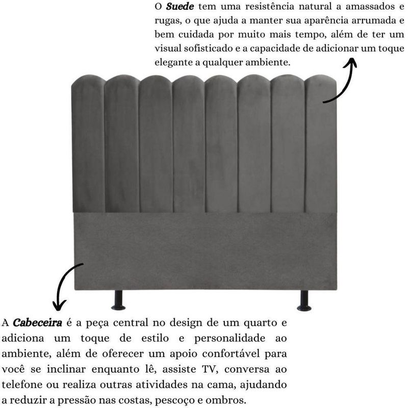 Cabeceira Nuvem Cama King 195 Cm Alanis Suede Cinza EscuroTransforme o seu quarto em um refúgio aconchegante com a deslumbrante Cabeceira Estofada Alanis. Cada detalhe desta peça foi cuidadosamente concebido para elevar a estética do ambiente, proporcionando não apenas beleza, mas também funcionalidade.O design único em formato de nuvem é o diferencial que torna esta cabeceira uma escolha cativante para a decoração do seu quarto. Os contornos delicados e as linhas suaves garantem um visual convidativo, adicionando uma atmosfera acolhedora ao espaço.Além de seu apelo estético, a Cabeceira Estofada Alanis oferece uma funcionalidade notável. Não se trata apenas de um complemento para a sua cama, mas também de um suporte aconchegante para suas costas quando você estiver sentado, proporcionando momentos de relaxamento e conforto.Fabricada com precisão em madeira eucalipto de alta qualidade, esta cabeceira é revestida em suede, um tecido macio que confere um toque de luxo. A combinação de materiais duráveis e a atenção aos detalhes tornam-na o acessório perfeito para valorizar a decoração do seu quarto, adicionando um toque de sofisticação.Dimensões:Altura: 126 cmLargura: 195 cmProfundidade: 10 cmAltura dos pés: 13 cmPeso: 12 KgEspecificações do Produto:Estrutura: Madeira EucaliptoTecido: SuedeMaterial dos Pés: PlásticoGarantia: 90 dias contra defeitos de fabricaçãoMontagem: Produto entregue montado, necessitando apenas rosquear os pés (2)Instruções de Limpeza: Utilizar um pano limpo e levemente úmidoEntrega: 01 volumeObservações Relevantes:Produto projetado para uso residencial em ambiente interno, evitando exposição direta ao sol, calor e umidade excessiva.Possível variação de tonalidade entre a imagem e o produto real devido ao tratamento de imagens e calibração de cores do monitor.Variação de cor pode ocorrer em futuras compras devido a lotes diferentes do fabricante do tecido.Imagens são meramente ilustrativas e não incluem objetos de decoração e eletrodomésticos.Recomenda-se verificar as dimensões do produto no momento da compra para garantir que passe normalmente por escadas, elevadores, portas e corredores.Não perca a oportunidade de transformar o seu espaço pessoal em um oásis de conforto. Adquira agora a Cabeceira Estofada Alanis e experimente a combinação perfeita de estilo e funcionalidade para o seu quarto.Decoração de QuartoElegânciaDesign ExclusivoAconchegoSofisticaçãoDurabilidadeEstilo ÚnicoCharme ResidencialSuavidadeConforto VisualQualidade PremiumEstofamento de LuxoQuarto AconcheganteEstilo ContemporâneoDesign InovadorSuavidade do SuedeSofisticação ResidencialAmbiente AcolhedorBeleza ÚnicaConforto Estilizado