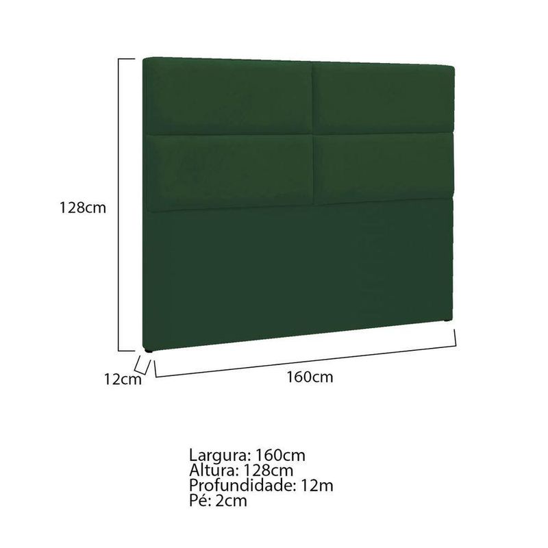Cabeceira Queen Berlim P04 160 Cm Suede - Amarena Móveis Cor Verde Tca 947Se você procura um móvel que proporcione mais beleza para o seu quarto, gerando além disso uma sensação de ambiente harmônico, por ser uma peça que agrega valor à cama, deixando-a não somente mais bonita, mas também, aconchegante, a cabeceira Dama foi feita para você! Possibilitando um excelente acabamento, a Cabeceira Queen Berlim P04 160 cm é capaz de dar completude ao ambiente, gerando uma sensação de tranquilidade, necessária para garantir seu tão merecido descanso. Adquira a sua agora mesmo!Especificações Técnicas da Cabeceira Queen Berlim P04 160 cm:-Altura: 128 cm;-Largura Total: 160 cm;-Profundidade: 12 cm;-Altura do Pé: 2 cm;Diferenciais da Cabeceira Queen Berlim P04 160 cm:-Material da Estrutura: fabricado com Madeira Pinus e Eucalipto, e alguns detalhes em MDF;-Detalhes do Pé: acompanha sapata plástica, com alta resistência;Recomendações de limpeza:-Limpar com flanela limpa e seca. Não molhar o móvel e não expor em lugar úmido ou próximo de fontes de calor. Não usar produtos abrasivos.Observações Importantes:- As imagens ambientadas são meramente ilustrativas e podem apresentar itens que não compõe o produto;- Objetos decorativos que aparecem na foto não acompanham o produto;- As cores do produto podem variar de acordo com o monitor, a iluminação do ambiente, ou sua percepção visual;- A Cabeceira Queen Berlim P04 160 cm ;-;-;- Produto para residencial em ambiente interno, não devendo ficar exposto diretamente ao sol, calor e umidades excessivas.