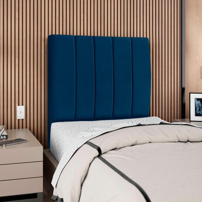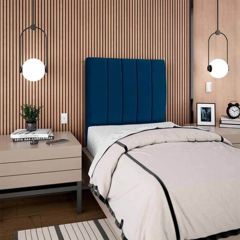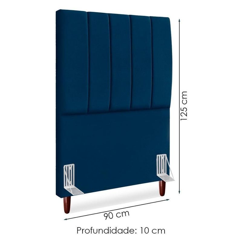 Cabeceira Solteiro 90 Cm Com Frame Carla Suede Azul Marinho Artte Azul MarinhoCabeceira Solteiro Carla, moderna e aconchegante trazendo elegância para seu quarto! Estrutura em Madeira de Eucalipto (reflorestada), estofada em espuma (densidade D-18) e revestida em tecido Suede (clássico aveludado com toque suave). Incluso Frame (metal resistente com reforço lateral e acabamento em pintura epóxi) para fixação em camas Box e pés em madeira maciça (12 cm). Pode haver variação no design do frame dependendo do lote de peças. A função do acessório e usabilidade permanece a mesma. Este produto será entregue em 1 volume.Medidas:Altura: 125 cmLargura: 90 cmProfundidade: 10 cmEspecificações Técnicas:Modelo: CarlaMateriais: Madeira (Eucalipto), espuma e tecido.Estilo: ModernoAmbiente: QuartoSistema de montagemCabeceira já montada, necessita fixação dos pés e Frame na cabeceira e na cama.Montagem, desmontagem e outras instalações serão de responsabilidade do cliente!Recomendação de LimpezaPara a limpeza, utilize um pano seco para retirada do pó.Evite o uso de produtos abrasivos e o contato direto com a umidade.Cabeceira versátil que valoriza a decoração e garante maior aconchego ao seu descanso.Importante SaberAs imagens são meramente ilustrativas, não acompanham objetos de decoração e eletrônicos.A tonalidade da cor do produto pode variar de acordo a calibração de cores do seu monitor, a iluminação do ambiente ou sua percepção visual.O cliente deve verificar a quantidade de VOLUMES descritos na nota, a situação da embalagem, caso haja algum dano NÃO ASSINE o comprovante de recebimento e RECUSE a mercadoria.Não nos responsabilizamos por subir escadas/elevadores ou pelo transporte por guincho em apartamentos. Eventuais despesas são de responsabilidade do comprador.Confira as dimensões do produto e certifique-se de que passarão normalmente por supostos elevadores, portas, escadas ou corredores de sua residência. Recomendamos que o responsável pelo recebimento confira se os produtos entregues correspondem ao modelo e à quantidade adquirida.Garantia De Fábrica90 dias para eventuais defeitos de fabricação. Produto: Cabeceira Solteiro 90 cm Com Frame | Classificação da Cama: Solteiro | Largura: 90 cm | Tamanhos de cama: Solteiro | Marca: Arte das Cabeceiras | Altura: 125 cm | Quantidade de caixas de embalagem: 1 | Profundidade: 10 cm | Cor: Azul Marinho