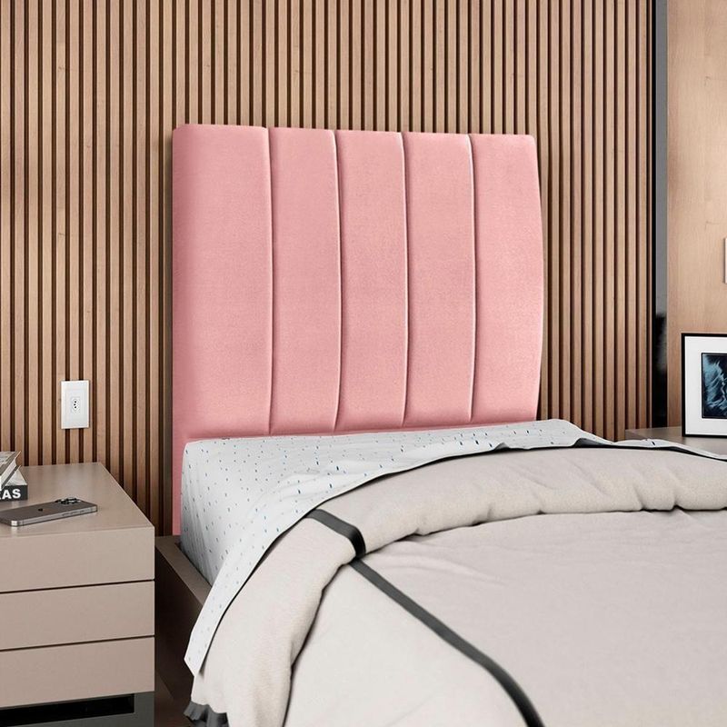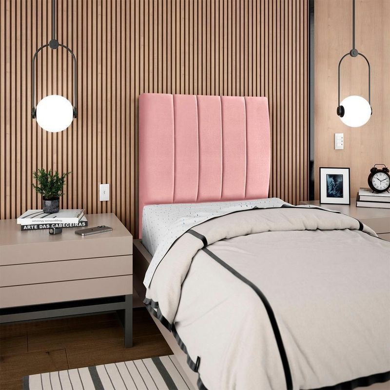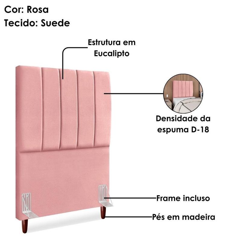 Cabeceira Solteiro 90 Cm Com Frame Carla Suede Rosa Artte RosaCabeceira Solteiro Carla, moderna e aconchegante trazendo elegância para seu quarto! Estrutura em Madeira de Eucalipto (reflorestada), estofada em espuma (densidade D-18) e revestida em tecido Suede (clássico aveludado com toque suave). Incluso Frame (metal resistente com reforço lateral e acabamento em pintura epóxi) para fixação em camas Box e pés em madeira maciça (12 cm). Pode haver variação no design do frame dependendo do lote de peças. A função do acessório e usabilidade permanece a mesma. Este produto será entregue em 1 volume.Medidas:Altura: 125 cmLargura: 90 cmProfundidade: 10 cmEspecificações Técnicas:Modelo: CarlaMateriais: Madeira (Eucalipto), espuma e tecido.Estilo: ModernoAmbiente: QuartoSistema de montagemCabeceira já montada, necessita fixação dos pés e Frame na cabeceira e na cama.Montagem, desmontagem e outras instalações serão de responsabilidade do cliente!Recomendação de LimpezaPara a limpeza, utilize um pano seco para retirada do pó.Evite o uso de produtos abrasivos e o contato direto com a umidade.Cabeceira versátil que valoriza a decoração e garante maior aconchego ao seu descanso.Importante SaberAs imagens são meramente ilustrativas, não acompanham objetos de decoração e eletrônicos.A tonalidade da cor do produto pode variar de acordo a calibração de cores do seu monitor, a iluminação do ambiente ou sua percepção visual.O cliente deve verificar a quantidade de VOLUMES descritos na nota, a situação da embalagem, caso haja algum dano NÃO ASSINE o comprovante de recebimento e RECUSE a mercadoria.Não nos responsabilizamos por subir escadas/elevadores ou pelo transporte por guincho em apartamentos. Eventuais despesas são de responsabilidade do comprador.Confira as dimensões do produto e certifique-se de que passarão normalmente por supostos elevadores, portas, escadas ou corredores de sua residência. Recomendamos que o responsável pelo recebimento confira se os produtos entregues correspondem ao modelo e à quantidade adquirida.Garantia De Fábrica90 dias para eventuais defeitos de fabricação. Produto: Cabeceira Solteiro 90 cm Com Frame | Classificação da Cama: Solteiro | Largura: 90 cm | Tamanhos de cama: Solteiro | Marca: Arte das Cabeceiras | Altura: 125 cm | Quantidade de caixas de embalagem: 1 | Profundidade: 10 cm | Cor: Rosa