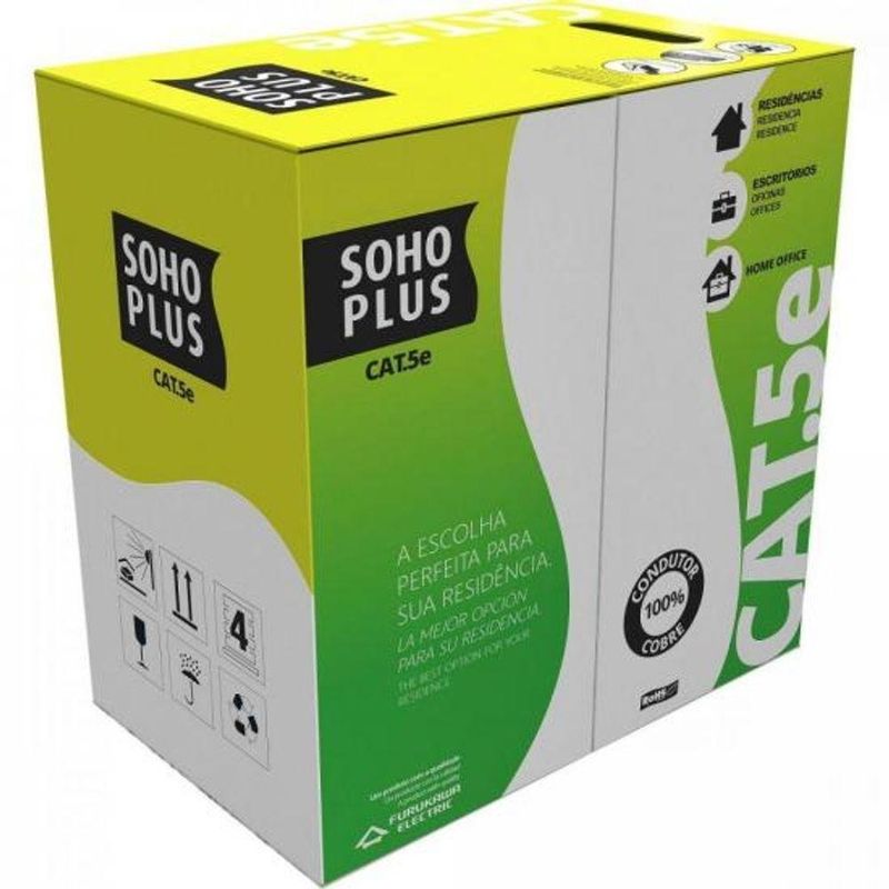 Cabo De Rede Preto Cx 305m Cat.5e Cmx Furukawa Sohoplus - Cx / 305A Furukawa Sohoplus é uma solução confiável para sua rede. O cabo 24AWG x 4P CAT 5e possui 4 pares trançados compostos de condutores sólidos de cobre nu, 24 AWG, isolados em polietileno especial. Capa externa em PVC não propagante à chama, na cor azul.Tipo:SOHOPLUSAplicação:RedesCor:PretoBitola:Diâmetro nominal 5.1mmImpedância:- Resistência elétrica CC máxima do condutor em 20ºC:93,8ohms/km - Impedância Característica Nom. de 1 MHz a 250 Mhz: 100 +ou- 15% ohmsRevestimento:PVC retardante a chamaPesquisa:cabo|rede|cat5e|cmx|preto|cxc305m|cat-5e|cat 5e|Furukawa| - Categoria: CAT.5e; - Construção: U/UTP - 4 pares trançados compostos de condutores sólidos de cobre nu, 24 AWG, isolados em polietileno especial; - Cor padrão: Preto; - Capa externa: PVC na opção CMX; - Marcação sequencial métrica decrescente (305 - 0 m), que facilita a visualização da quantidade restante na caixa e no cálculo dos lances para instalação; - Diâmetro nominal: 4,8mm; - Massa líquida: 26 kg/km; - Velocidade de propagação nominal: 68%; - Grau de flamabilidade CMX: norma IEC 60332-1; - Peso do cabo: 31Kg/km. Temperatura: - Instalação: 0ºC a 40ºC; - Armazenamento: -20ºC a 70ºC; - Operação: -10ºC a 60ºC. Dimensões: - 310,5 x 320 x 210,5mm (A x L x C). Número de Homologação Anatel: 00036-08-00256A Furukawa Sohoplus é uma solução confiável para sua rede. O cabo 24AWG x 4P CAT 5e possui 4 pares trançados compostos de condutores sólidos de cobre nu, 24 AWG, isolados em polietileno especial. Capa externa em PVC não propagante à chama, na cor azul.Tipo:SOHOPLUSAplicação:RedesCor:PretoBitola:Diâmetro nominal 5.1mmImpedância:- Resistência elétrica CC máxima do condutor em 20ºC:93,8ohms/km - Impedância Característica Nom. de 1 MHz a 250 Mhz: 100 +ou- 15% ohmsRevestimento:PVC retardante a chamaPesquisa:cabo|rede|cat5e|cmx|preto|cxc305m|cat-5e|cat 5e|Furukawa| - Categoria: CAT.5e; - Construção: U/UTP - 4 pares trançados compostos de condutores sólidos de cobre nu, 24 AWG, isolados em polietileno especial; - Cor padrão: Preto; - Capa externa: PVC na opção CMX; - Marcação sequencial métrica decrescente (305 - 0 m), que facilita a visualização da quantidade restante na caixa e no cálculo dos lances para instalação; - Diâmetro nominal: 4,8mm; - Massa líquida: 26 kg/km; - Velocidade de propagação nominal: 68%; - Grau de flamabilidade CMX: norma IEC 60332-1; - Peso do cabo: 31Kg/km. Temperatura: - Instalação: 0ºC a 40ºC; - Armazenamento: -20ºC a 70ºC; - Operação: -10ºC a 60ºC. Dimensões: - 310,5 x 320 x 210,5mm (A x L x C). Número de Homologação Anatel: 00036-08-00256