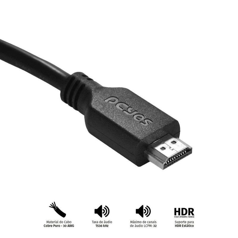 Cabo Hdmi 2.0 4k 30awg Puro Cobre 1 Metro - Phm20-1Os cabos da PCYES chegaram para determinar um novo patamar de qualidade para aqueles que buscam mais para seus equipamentos de nível profissional, unindo inovação a um custo acessível!São duas linhas completamente desenvolvidas para suprir as necessidades até do consumidor mais exigente, utilizando de design, alta tecnologia e materiais de qualidade para alcançar a excelência.Projetados com foco nos entusiastas, os cabos da PCYES possuem design exclusivo e 100% brasileiro, que combina robustez com minimalismo, além de levar em si a essência da marca, garantindo maior durabilidade e desempenho.Descrição:Este cabo é indicado para dispositivos que possuam conexão HDMI tais como: TVs, monitores, Aparelhos Blu-ray, video-games, placas de vídeo, notebooks etcDados Técnicos:Tamanho do cabo: 1MMaterial do cabo: cobre puro30 AWGLargura de banda máxima: 18Gbit/sResolução máxima: 4K (60Hz)Máximo de canais de áudio LCPM: 32Taxa de áudio: 1536 kHzHDR EstáticoSuporta 3DPossui conexão EthernetConector HDMI macho/macho