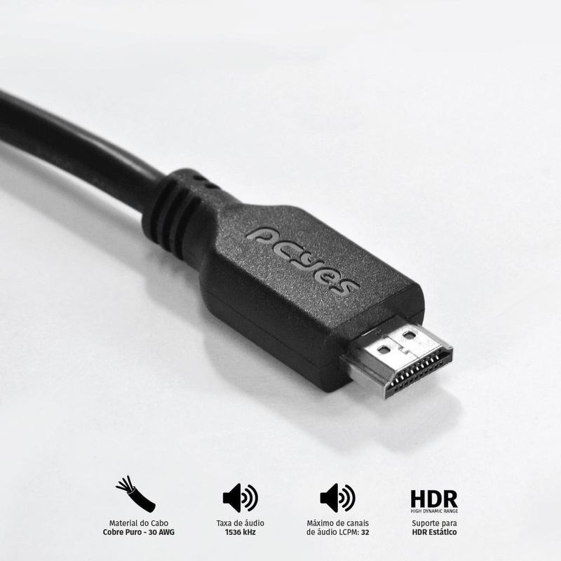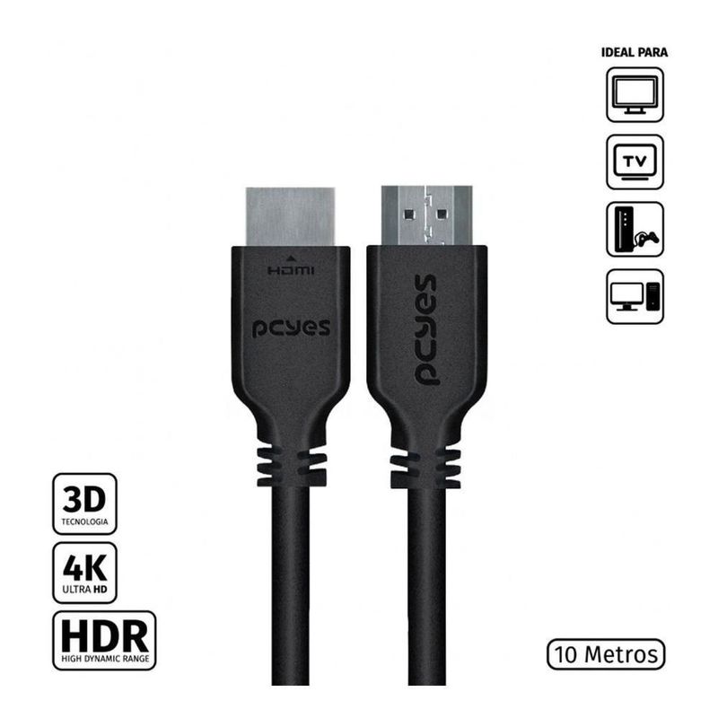 Cabo Hdmi 2.0 4k 30awg Puro Cobre 10 Metros - Phm20-10Os cabos da PCYES chegaram para determinar um novo patamar de qualidade para aqueles que buscam mais para seus equipamentos de nível profissional, unindo inovação a um custo acessível!São duas linhas completamente desenvolvidas para suprir as necessidades até do consumidor mais exigente, utilizando de design, alta tecnologia e materiais de qualidade para alcançar a excelência.Projetados com foco nos entusiastas, os cabos da PCYES possuem design exclusivo e 100% brasileiro, que combina robustez com minimalismo, além de levar em si a essência da marca, garantindo maior durabilidade e desempenho.Descrição:Este cabo é indicado para dispositivos que possuam conexão HDMI tais como: TVs, monitores, Aparelhos Blu-ray, video-games, placas de vídeo, notebooks etcDados Técnicos:Tamanho do cabo: 10MMaterial do cabo: cobre puro30 AWGLargura de banda máxima: 18Gbit/sResolução máxima: 4K (60Hz)Máximo de canais de áudio LCPM: 32Taxa de áudio: 1536 kHzHDR EstáticoSuporta 3DPossui conexão EthernetConector HDMI macho/macho