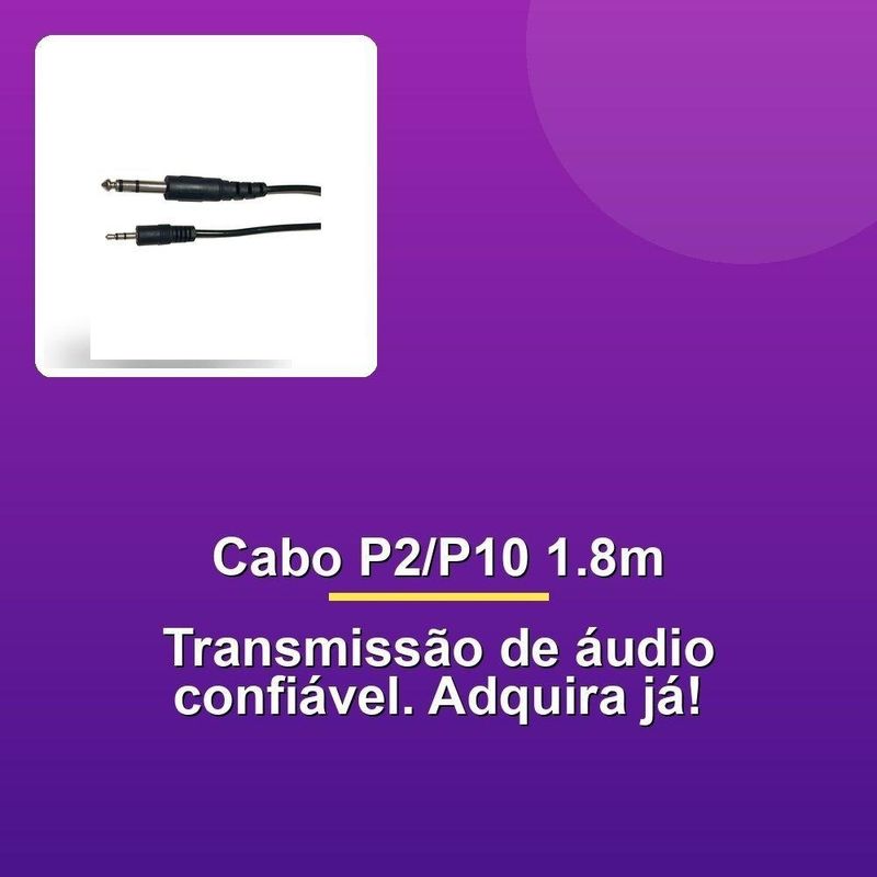 Cabo P2 Stereo X P10 Stereo 1.8m PretoO Cabo P2 Stereo X P10 Stereo 1,80 Metro Preto é a escolha ideal para quem busca qualidade, durabilidade e desempenho em suas conexões de áudio. Com plug P2 estéreo e plug P10 estéreo, este cabo oferece uma transmissão de som limpa e sem interferências, garantindo uma experiência auditiva superior. Seu comprimento de 1,80 metro proporciona uma excelente flexibilidade e praticidade, permitindo maior alcance em diferentes configurações de uso.Fabricado na cor preta, seu design discreto e elegante combina perfeitamente com qualquer equipamento, seja em estúdios profissionais, em casa ou em apresentações ao vivo. Este cabo foi desenvolvido com materiais de alta qualidade, resultado de um rigoroso processo de seleção dos melhores fornecedores. Isso não apenas assegura sua resistência ao uso cotidiano, mas também sua confiabilidade em situações de alta demanda.Ao escolher este produto, você está optando por uma solução que reflete nosso compromisso com a excelência. Cada detalhe foi pensado para oferecer a você uma experiência de compra e de uso que supere suas expectativas. Além disso, nossa equipe trabalha incansavelmente para garantir que a entrega seja rápida e eficiente, porque sabemos o quanto é importante para você contar com produtos de qualidade no menor tempo possível.Acreditamos que a qualidade não é apenas uma característica, mas um verdadeiro reflexo do nosso compromisso com a sua satisfação. Esse cabo é um produto que você pode confiar e se orgulhar de utilizar, seja para conectar instrumentos musicais, equipamentos de áudio ou sistemas de som. Não perca a oportunidade de contar com um acessório que une funcionalidade, resistência e desempenho. Faça sua compra agora e descubra por que este cabo é a escolha certa para você!O Cabo P2 Stereo X P10 Stereo 1,80 Metro Preto é a escolha ideal para quem busca qualidade, durabilidade e desempenho em suas conexões de áudio. Com plug P2 estéreo e plug P10 estéreo, este cabo oferece uma transmissão de som limpa e sem interferências, garantindo uma experiência auditiva superior. Seu comprimento de 1,80 metro proporciona uma excelente flexibilidade e praticidade, permitindo maior alcance em diferentes configurações de uso.Fabricado na cor preta, seu design discreto e elegante combina perfeitamente com qualquer equipamento, seja em estúdios profissionais, em casa ou em apresentações ao vivo. Este cabo foi desenvolvido com materiais de alta qualidade, resultado de um rigoroso processo de seleção dos melhores fornecedores. Isso não apenas assegura sua resistência ao uso cotidiano, mas também sua confiabilidade em situações de alta demanda.Ao escolher este produto, você está optando por uma solução que reflete nosso compromisso com a excelência. Cada detalhe foi pensado para oferecer a você uma experiência de compra e de uso que supere suas expectativas. Além disso, nossa equipe trabalha incansavelmente para garantir que a entrega seja rápida e eficiente, porque sabemos o quanto é importante para você contar com produtos de qualidade no menor tempo possível.Acreditamos que a qualidade não é apenas uma característica, mas um verdadeiro reflexo do nosso compromisso com a sua satisfação. Esse cabo é um produto que você pode confiar e se orgulhar de utilizar, seja para conectar instrumentos musicais, equipamentos de áudio ou sistemas de som. Não perca a oportunidade de contar com um acessório que une funcionalidade, resistência e desempenho. Faça sua compra agora e descubra por que este cabo é a escolha certa para você!