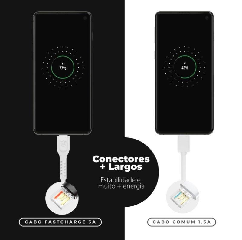 LEIA ANTES DE COMPRARAtualmente, existem 3 tipos de entrada USB: a Micro USB V8, a Tipo-C (ou Type-C) e a Lightning. É muito importante verificar qual a entrada do seu smartphone antes de comprar um cabo. Atente-se para a diferença entre os modelos! O Lightning é usado SOMENTE pela Apple, ou seja, todo iPhone possui entrada Lightning. O tipo Micro USB V8 é aquele mais tradicional, com um formato que lembra um trapézio (uma base maior e outra base menor). Já oTipo-C (ou Type-C) é simétrico, não possuindo lado diferentes - suas bordas são arredondadas. Qualquer dúvida utilize o campo de perguntas no final da página ou leia as avaliações de outros consumidores. O cabo Dual Shock, da Gorila Shield, possui 1,2m de cabo revestido em PVC reforçado, proporcionando mais resistência e maior durabilidade ao acessório. Para quem possui aparelhos com a tecnologia Qualcomm 3.0, o Dual Shock é compatível. Para guardar o cabo de uma forma mais segura, prenda o acessório com a presilha Smart Arrange.ATENÇÃO: Na hora de usar e guardar o cabo deve-se tomar cuidado para NÃO DOBRAR as pontas do acessório. Ainda que ele seja reforçado, o ato de dobrá-lo com frequência danifica o interior do objeto! Se tiver dúvidas utilize o campo de perguntas no final da página ou leia as avaliações de outros consumidores.ESPECIFICAÇÕES Material: revestimento de PVC reforçado Marca: Gshield Tamanho: 1,2m Cor: Branco Carregamento: Qualcomm 3.0 3ACOMPATIBILIDADE Compatível com aparelhos com entrada Micro USB V8GARANTIA 3 meses contra defeitos de fabricação + Garantia Vitalícia Co-Participativa