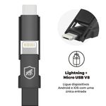 O Cabo Slim 3 em 1, da Gorila Shield, possui 3 entradas (Type C, Lightning e Micro USB V8) em um único cabo.Acompanha chaveiro, para facilitar o transporte; conectores mais largos, para melhor transferência de dados e energia, e uma presilha magnética, que une ambos os conectores. A entrada Type-C não é compatível com aparelhos Motorola. Obs: Esse produto não possui suporte ao carregamento Quick Charger 2.0 e 3.0, entretanto carrega o aparelho de forma eficaz.