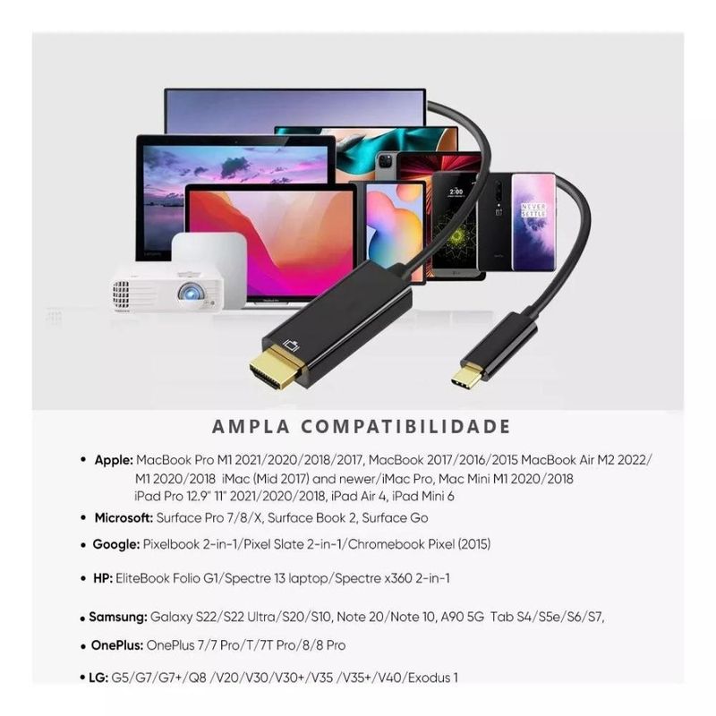 O Cabo Tipo C para HDMI é projetado para transmitir a tela do seu Macbook, Computador, Tablet e Smartphones para uma tela maior como SmarTV, HDTV, Projetores, Monitores dentre outros. É uma ótima escolha para a educação on-line, análise de dados e no escritório em (Home Office).O cabo HDMI suporta resoluções de vídeo até 4k, possibilitando estender a interface do seu aparelho portátil para vários outros sistemas ao mesmo tempo. Realizando o espelhamento do seu dispositivo a telas maiores para um melhor prazer visual.IMPORTANTE: Antes de efetuar a compra verifique se o seu dispositivo possui a tecnologia “MHL”, aparelhos que não possuem essa tecnologia não permitem o espelhamento de telas. ESPECIFICACOES:Entrada: Tipo-C MachoSaída: HDMI MachoComprimento do Cabo: 1.8 MInterface: Plug-and-playConectores: Banhado a OuroRevestimento: PVC Premium – Involucro ABS altamente resistenteCor: PretoResolução: Suporta até 4K 30Hz COMPATIBILIDADE:- Mac Book Pro (2015/2016/2017/2018/2019/2020/2021/2022/M1/M2)- Mac Book Air (2015/2016/2017/2018/2019/2020/2021/2022/M1/M2)- iPad Pro (2022/2021/2020/2019/2018)- Pixelbook (2019/2018/2017)- XPS (13 polegadas / 15 polegadas)- Ipad (Que possua a entrada padrão Tipo-C)- Notebook (Que possua a entrada padrão Tipo-C) SISTEMAS SUPORTADOS:- Windows 11,10, 8, 7, Vista, XP, Mac OS X 10.6 ou posterior, Linux 2.6.14 ou posterior- IOS e Android CONTEUDO DA EMBALAGEM:1 X Cabo Tipo-C Macho para HDMI Macho 1.8 Metros