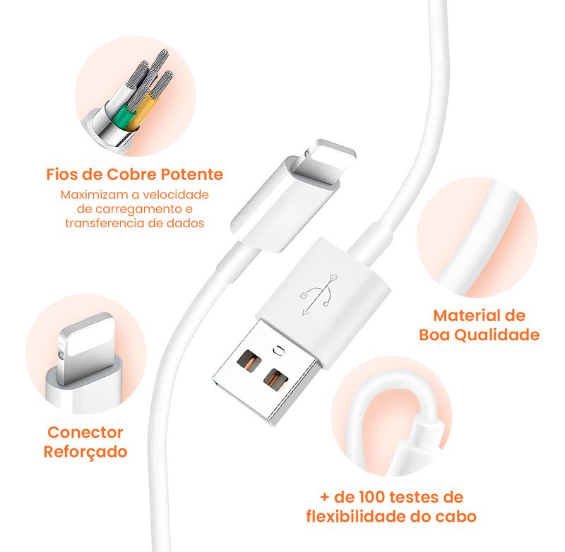 Cabo USB para Lightning de 1 metro, ideal para carregar e sincronizar dispositivos Apple como iPhone, iPad e iPod. Possui design resistente e flexível, garantindo durabilidade no uso diário. O comprimento de 1 metro oferece praticidade para uso em casa, no escritório ou em viagens. Compatível com carregadores USB e computadores, proporciona transferência de dados rápida e carregamento eficiente.
