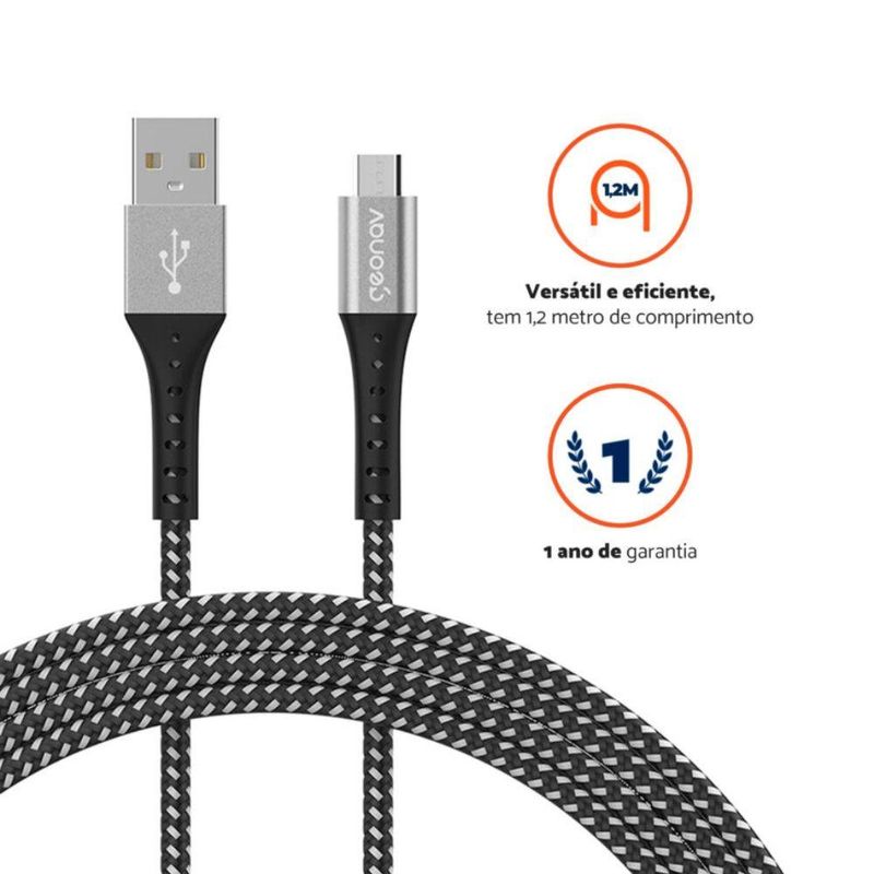 Características: Marca: Geonav Modelo: ESMIBK Cor: Preto O Cabo USB-A para Micro USB Geonav possui 1,20 metro de comprimento e foi desenvolvido para quem busca durabilidade e desempenho. Seu revestimento em nylon trançado garante alta resistência, suportando até 10 mil dobras, enquanto os conectores em alumínio anodizado oferecem maior proteção contra riscos e corrosão. Ideal para uso em escritórios, residências, carros e viagens, permite tanto carregamento eficiente quanto transferência de dados com segurança. Especificações Técnicas: Comprimento do cabo: 1,20 m Tipo de conector: USB-A para Micro USB Versão do conector: USB 2.0 Material: Nylon trançado e conector em alumínio anodizado Tensão de saída: Até 5V Corrente de saída: Até 2.4A Potência suportada: Até 12W Velocidade de transferência de dados: Até 480 Mbps Diâmetro do cabo: 0,3 / 0,2 cm Dimensões: 14x7x3 Peso: 30 g Conteúdo da Embalagem: 1x Cabo USB-A para Micro USB Geonav 1,20m (ESMIBK) Garantia: 12 meses