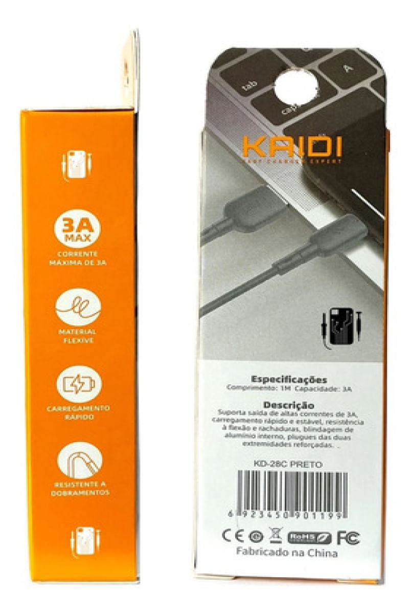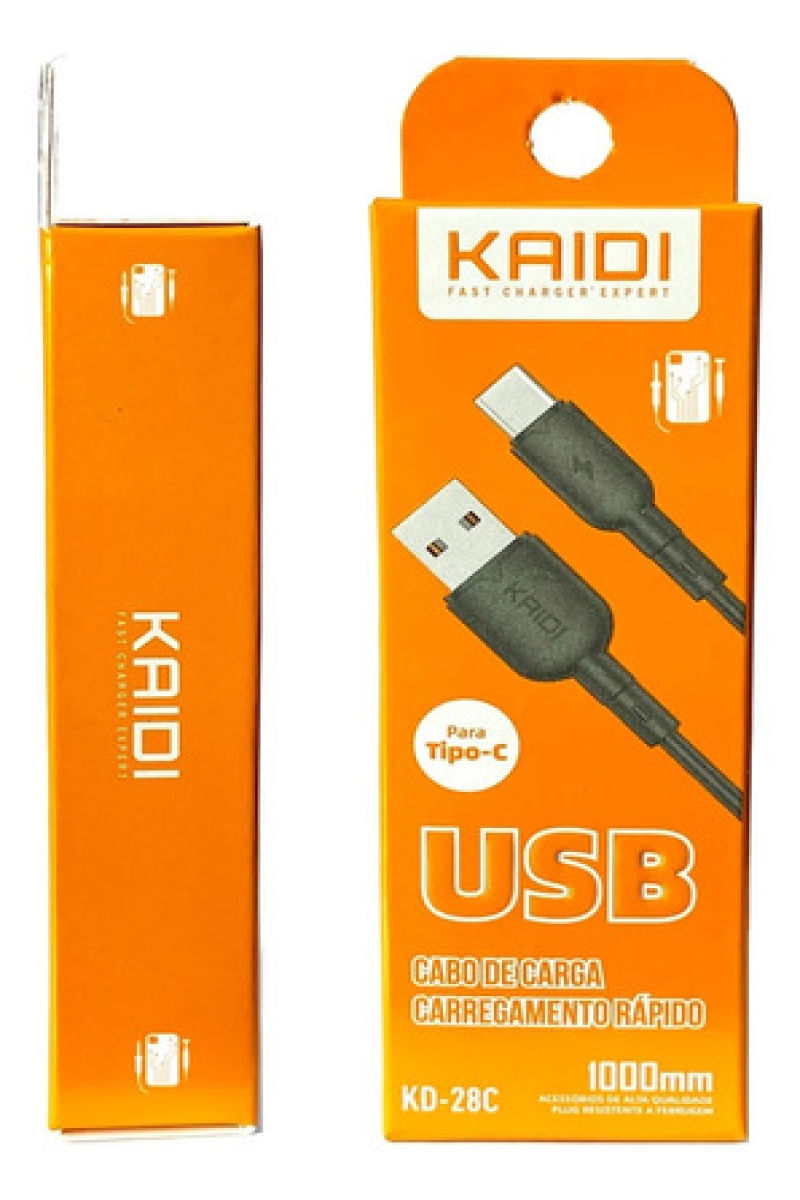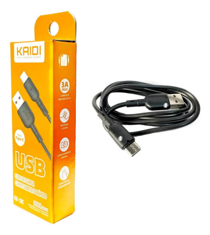 Cabo Usb Tipo C Kaidi. - Corrente máxima de 3A - Material flexível - Carregamento rápido - Resistente a dobramentos Compatível com qualquer dispositivo com saida USB TIPO C. Suporta saída de altas correntes de 3A, carregamento turbo e estável, resistência a flexão e rachaduras, blindagem de alumínio interno, plugues das duas extremidades reforçadas. DISPONIVEL NAS CORES PRETA E BRANCA, MAS ENVIADO CONFORME O ESTOQUE. Produto em estoque, envio imediato, de segunda a sexta.