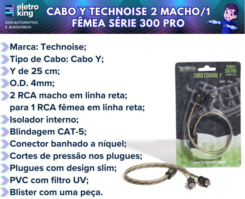 Cabo Y Technoise 2 Macho/1 Fêmea Serie 300 Pro A linha de cabos RCA e Y Series 300 PRO da TECHNOISE® é uma ótima opção custo x benefício para quem quer um sistema de som mais em conta com garantia de qualidade e um ótimo áudio. Com isolador interno e blindagem CAT-5 a linha é preparada contra ruídos externos que possam entrar na frequência do áudio. Seus plugues com design slim evitam que os cabos se dobrem atrás dos players, causando danos aos filamentos. Os seus plugues são banhados à níquel e possuem cortes em seu pino e em seu encaixe, proporcionando pressão ao encaixar nos aparelhos, evitando que a trepidação comum em veículos cause ruídos no áudio. Especificações Técnicas: • Marca: Technoise • Tipo de Cabo: Cabo Y • Y de 25 cm • O.D. 4mm • 2 RCA macho em linha reta para 1 RCA fêmea em linha reta • Isolador interno • Blindagem CAT-5 • Conector banhado a níquel • Cortes de pressão nos plugues • Plugues com design slim • PVC com filtro UV • Blister com uma peça Conteúdo da Embalagem: • 01 Cabo Y Technoise 2 Macho/1 Fêmea Serie 300 Pro Importante: • Garantia de 90 Dias. • Valor Unitário.