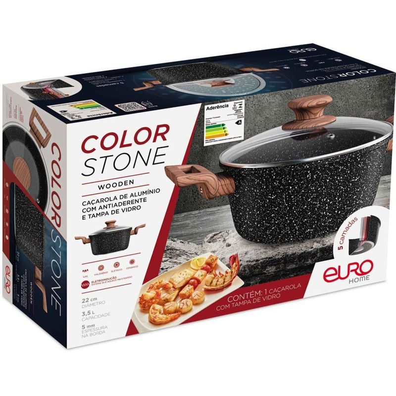 Com a Caçarola Colorstone você vai transformar seu jeito de cozinhar e seus pratos serão executados com excelência. Tudo isso porque as panelas Colorstone contam com o que há de mais moderno para garantir o preparo de refeições saborosas com máxima eficiência. A Caçarola Colorstone possui 5 camadas. A primeira camada é a antiaderente, ela evita que os ingredientes grudem mesmo com uso de pouquíssimo óleo. para garantir sua durabilidade, há uma segunda camada anti desgaste. A camada de alumínio cumpre a função de distribuir o calor do melhor modo possível, diminuindo o tempo de preparo das refeições. A quarta camada é a pintura ultra resistente, e a base de indução finaliza essa composição. A Colorstone é fácil de limpar, não deforma e estará sempre pronta para o próximo uso. Prepare refeições mais saborosas e saudáveis com as panelas Colorstone. Especificações • Marca: Euro • Refêrencia: ALU8600-WD • Material: Alumínio / PTFE / Baquelite / Aço inox / Pintura • Cor: Preta • Antiaderente • Tampa de Vidro • Medidas Aproximadas: 23,5 cm x 35,5 cm x 11 cm • Capacidade: 3,5 Litros • Espessura: 5 mm na borda/ 2.3 mm no corpo • Alças: Baquelite com pintura siliconada soft touch Cabo não esquenta • Fundo com eletroindução, pode ser usada em fogões de indução, a gás, halogênio, cerâmico ou elétrico. • Garantia do Fornecedor: 03 meses contra defeitos de fabricação • Validade: Indeterminada Itens Inclusos: • 01 Caçarola 22 cm com tampa *As cores podem variar entre as imagens mostradas acima e o produto. Imagens meramente ilustrativas. *Só comercializamos produtos novos, originais e lacrados em caixa.