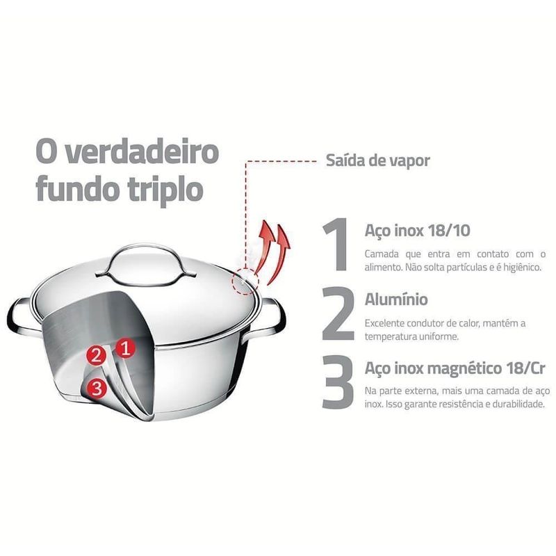 Caçarola Rasa Tramontina Allegra Em Aço Inox Com Fundo Triplo 24 Cm 4,2 L 62653240CAÇAROLA RASA TRAMONTINA ALLEGRA EM AÇO INOX COM FUNDO TRIPLO 24 CM 4,2 L CÓD 62653240Marca: TramontinaModelo: Allegra em Aço Inox com Fundo Triplo 24 cm 4,2 LDESCRIÇÃO DA CAÇAROLA RASA TRAMONTINA EM AÇO INOX- Produtos funcionais e práticos são perfeitos para nos acompanhar no dia-a-dia.- Com Caçarola Rasa Tramontina Allegra em Aço Inox com Fundo Triplo 24 cm de diâmetro 4,2 L você vai adquirir uma peça completa para o preparo de diferentes receitas.- Com design diferenciado, ela é uma peça moderna perfeita para embelezar o ambiente. Possui fundo triplo (aço inox + alumínio + aço inox), tecnologia que distribui melhor o calor, cozinhando os alimentos de forma uniforme com menos gasto de energia.- E o melhor, ficam quentinhos por mais tempo! É muito versátil e pode ir ao forno gratinar ou finalizar pratos e também ser utilizada em diferentes tipos de fogões.- É altamente durável e garante qualidade, já que é totalmente produzida em aço inox.- É um utensílio que atende as necessidades na cozinha e ainda dá um toque de beleza para suas receitas.INFORMAÇÕES GERAIS DA CAÇAROLA RASA TRAMONTINA EM AÇO INOX- Mais saudável: por ser feita de aço inoxidável, a caçarola Tramontina não libera nenhum tipo de resíduo nas suas receitas.- Fácil de usar: uma caçarola prática para todas as suas receitas e que faz bonito em qualquer tipo de fogão: gás, elétrico, vitrocerâmico e indução. Ainda possui tampa com saída de vapor e encaixe perfeito.- Mais durável: o inox Tramontina é uma matéria-prima nobre, resistente e que vai fazer bonito por muito mais tempo na cozinha.- Economiza tempo e energia: o segredo está no fundo triplo (aço inox + alumínio + aço inox), que distribui o calor uniformemente, proporcionando um cozimento mais rápido. Por isso, você pode manter o fogo baixo durante todo o preparo e, assim, poupar energia. Além disso, a caçarola toda em aço inox pode ir ao forno para gratinar ou finalizar pratos, na temperatura máxima de 260°C.- Fácil de limpar: deixar sua caçarola brilhando é simples, você só precisa de água, sabão e uma esponja macia. Se preferir, é só colocar na máquina de lavar.ORIENTAÇÕES GERAIS DA CAÇAROLA RASA TRAMONTINA EM AÇO INOX- A capacidade volumétrica máxima para cozimento é de 3/4 da capacidade total da peça.- Antes de utilizar o produto, remover as eventuais etiquetas e lavar com água quente e detergente.- Use uma fonte de calor brando para evitar que o alimento grude no fundo da caçarola. O fundo triplo distribui uniformemente o calor, não sendo necessário o fogo alto. E, além disso, você economiza energia.- Quando a caçarola for utilizada no fogão a gás, a chama não deve ultrapassar a base da caçarola. No caso de uso de chapa elétrica, a chapa deverá ter diâmetro igual ou inferior ao da caçarola.- Sempre dissolva o sal em água fervendo ou com os alimentos, mexendo os ingredientes no início do cozimento.- Não aqueça o alimento colocando uma caçarola do mesmo diâmetro sobre a outra. Esse procedimento é perigoso, pois cria vácuo e impossibilita a retirada do mesma.- Se a tampa da caçarola de aço inox Tramontina ficar presa pelo efeito do vácuo durante o resfriamento, basta puxar ou aquecer novamente até neutralizar o efeito do vácuo.- As alças de inox aquecem durante o cozimento. Aconselhamos o uso de luvas durante o manuseio.- Alguns alimentos que possuem amido, como massa e arroz, poderão deixar manchas na parte interna da caçarola durante o cozimento. Para remover facilmente as manchas, passe um pano umedecido com suco de limão ou vinagre, ou use a Pasta para Polir e Remover Manchas Tramontina.- Evite deixar alimento na caçarola por muito tempo; o sal também pode provocar manchas.- Para que a caçarola de aço inox fique sempre bonita e com brilho, recomendamos que seja lavada somente com detergente e esponja. A Tramontina desenvolveu uma pasta especial para polir e remover manchas nos produtos de aço inoxidável, que está disponível nos principais pontos de venda.- Depois da lavagem, sempre que possível, enxágue a caçarola com água quente e seque-a imediatamente, para que ela mantenha o brilho original, pois o cloro e as substâncias contidas na água podem deixar manchas na caçarola.- Pode ir ao forno em temperatura máxima de 260°C, podendo haver mudança na coloração.- Não deixe a caçarola vazia sobre uma fonte de calor. Deixe caçarolas quentes somente em superfícies resistentes ao calor.CERTIFICAÇÃO- Produto com certificação compulsória certificada pela OCP 0104- PCN DO BRASIL, registro 001470/2018, conforme portaria INMETRO 419/2012.GARANTIA- 90 dias de garantia legal para vícios ou defeitos de fabricação.DIMENSÕES- Dimensões Embalagem (Compr. X Larg. X Alt.): 317x 263x 166 mm;- Dimensões Produto (Compr. X Larg. X Alt.): 282x 275x 120 mm. Tipo de panela: Tachos | Capacidade em volume: 4,2 L | Formato de venda: Unidade | Unidades por kit: 1 | Quantidade de sistemas de segurança: 0 | Tipos de fogões compatíveis: gás, elétrico, vitrocerâmico, indução | Tipo de revestimento exterior: Aço inoxidável | Tipo de revestimento interior: Aço inoxidável | Tipo de base: Tripla | Material da panela: Aço inoxidável | Com sistema de fechamento automático: Não | Com revestimento antiaderente: Não | Inclui tampa: Sim | Altura: 12 cm | Largura: 27,5 cm | Diâmetro: 24 cm | Peso: 1,55 kg | Linha: Allegra | Material da tampa: Aço inoxidável | Material da alça: Aço inoxidável | Forma: Circular | É apto para lava-louças: Sim | cor: inox | EmbalagemLargura-cm: 29 | Peso Líquido: 1.5500 | Marca: Tramontina | EmbalagemAltura-cm: 14 | Modelo: Allegra | Cubagem: 0.012180 | EmbalagemComprimento-cm: 30 | Dias Entrega Fornecedor: 0