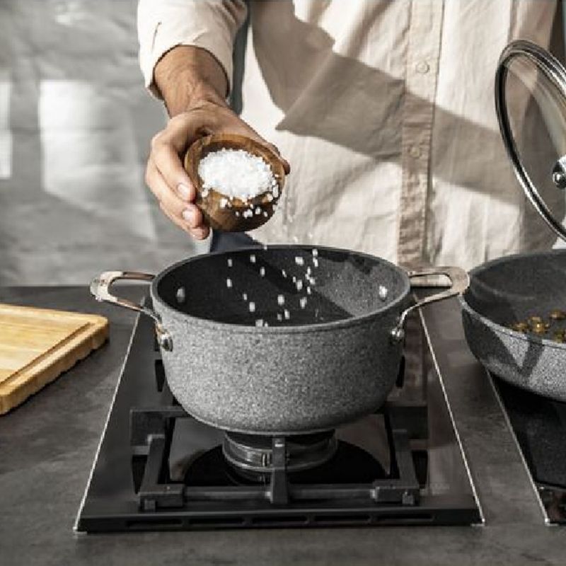 A caçarola Ballarini Salina 20 cm com tampa de vidro é um clássico indispensável para o uso diário na cozinha. Produzida em alumínio forjado, proporciona aquecimento rápido e distribuição de calor eficiente, sendo ideal para receitas práticas como massas de uma panela só, legumes salteados e pratos do dia a dia. Seu design elegante com acabamento efeito granito alia estética sofisticada a alto desempenho culinário. - Destaques• Revestimento antiaderente Granitium Titanium Extreme• Estrutura em alumínio forjado para aquecimento rápido• Alta resistência a riscos e abrasão• Tecnologia Radiant Induction para melhor distribuição de calor• Alça em aço inox que permanece fria durante o uso• Compatível com fogões de indução• Uso seguro em forno• Fácil de limpar e compatível com lava-louças - Especificações• Marca: Ballarini• Linha: Salina• Material: alumínio• Revestimento interno: PTFE antiaderente• Acabamento: revestido• Cor: cinza pedra• Capacidade: 2,67L• Compatibilidade: indução• Uso em forno: sim• Lava-louças: sim• Altura: 14 cm• Largura: 20 cm• Comprimento: 20 cm• Peso: 1,197 kg - Observações• Inclui tampa de vidro• Design elegante com efeito granito• Ideal para preparos rápidos e receitas de uma panela