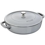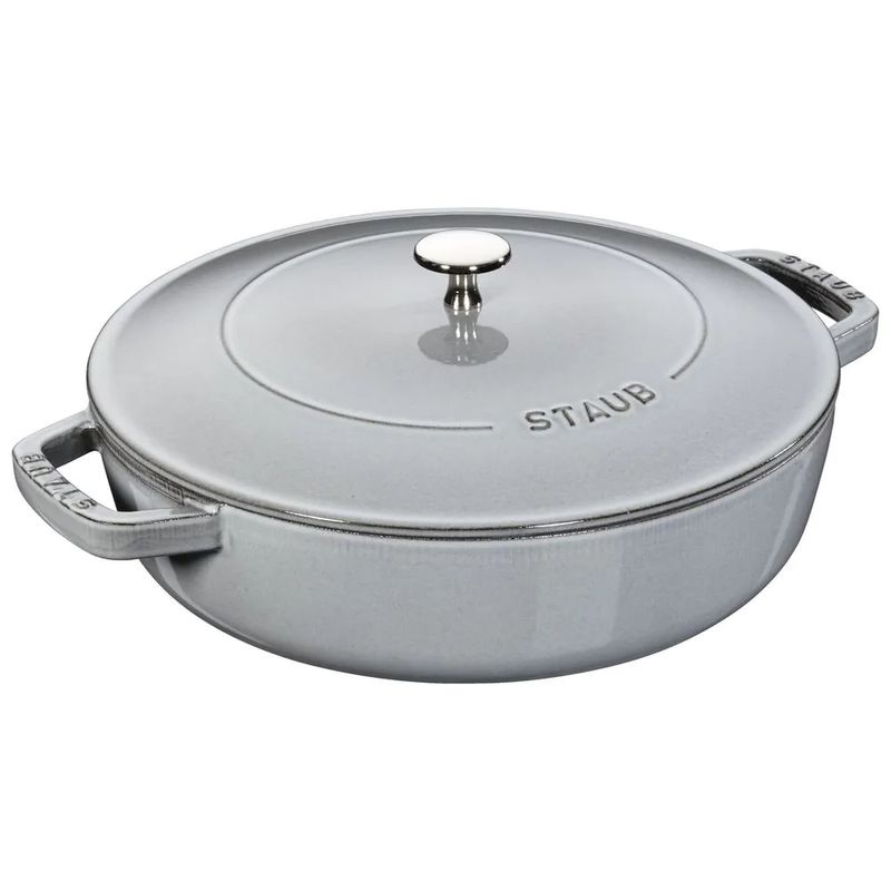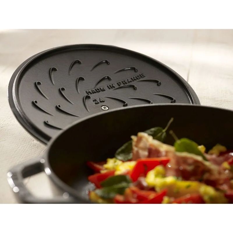 A caçarola STAUB é insuperável para cozimento de carnes e legumes de maneira lenta com uma maciez perfeita, e também para cozinhar ensopados e sopas. O ferro fundido possui qualidades excepcionais de retenção de calor pois a panela aquece uniformemente. A tampa inovadora apresenta pequenos picos no interior que liberam continuamente líquido condensado de volta para os alimentos, produzindo resultados úmidos, aromáticos e saborosos. O interior em esmalte preto fosco especial da STAUB e a tampa com sistema de irrigação garantem um assado dourado perfeito para alimentos imprimindo melhor sabor. Com seu requintado acabamento em esmalte, cada peça transita lindamente da cozinha para a mesa. De comida caseira a jantares suntuosos, todos os pratos são especiais quando servidos no STAUB. As panelas de ferro fundido esmaltado da STAUB são a escolha dos melhores chefs do mundo. Com durabilidade excepcional, é perfeito para o uso diário em cozinhas domésticas gourmet e restaurantes de prestígio em todo o mundo. O ferro fundido pode ser aquecido ou resfriado a temperaturas extremas portanto essas panelas podem ser utilizadas como coolers. Pode ser usado em todas as fontes de calor, incluindo a indução. Resistente a riscos e ferrugem. Pode ser levado inteiramente ao forno pois seu puxador de latão ou niquelado é resistente ao calor até 250 °C. Além de todos esses benefícios, o ferro é um material altamente sustentável por ser durável e reutilizável. Construídas para durar uma vida, essas peças de herança podem ser transmitidas de geração em geração. - Especificações: • Comprimento: 31cm• Altura: 9,5cm• Largura: 33cm• Material: Ferro fundido• Cor: Cinza grafite• Fontes de calor: Fogão a gás - Fogão elétrico - Fogão a indução - Forno
