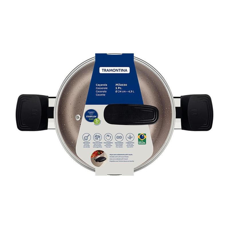 Com a Caçarola Tramontina Milazzo 24cm em Alumínio com Revestimento Antiaderente Starflon Max, suas receitas ganham sabor e praticidade com muito mais elegância. Fabricada em alumínio com 1,8 mm de espessura, ela garante aquecimento rápido e uniforme, além de contar com revestimento interno e externo antiaderente Starflon Max, que impede que os alimentos grudem e torna a limpeza muito mais fácil.Seu design é complementado por alças de baquelite antitérmico com acabamento soft-touch, que proporcionam segurança e conforto durante o uso. A tampa de vidro temperado com borda de aço inox e saída de vapor permite acompanhar o preparo dos alimentos sem perder calor. Com capacidade de até 5 litros, é ideal para refeições em família e pode ser utilizada em fogões a gás, elétrico e vitrocerâmico, oferecendo versatilidade para o dia a dia. Revestimento Starflon Max que evita que os alimentos grudem Tampa de vidro temperado com borda de inox e saída de vapor Alças antitérmicas com toque soft-touch Compatível com fogões a gás, elétrico e vitrocerâmico Beleza, segurança e alta durabilidade fazem da linha Milazzo da Tramontina a escolha certa para quem busca eficiência e sofisticação na cozinha.