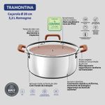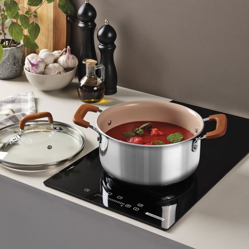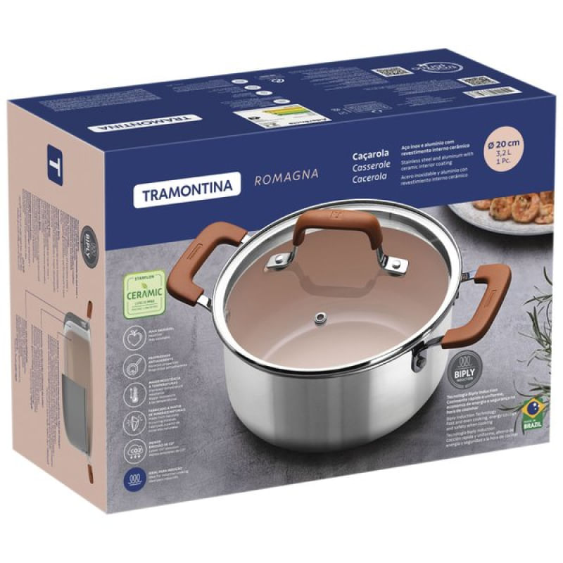 Caçarola Tramontina Romagna Aço Inox Alumínio Cerâmico Marfim 20 cm 3,2 L Tramontina - A caçarola Tramontina Romagna em aço inox e alumínio com revestimento interno cerâmico marfim de 20 centímetros de diâmetro e 3,2 litros é a escolha perfeita para quem busca praticidade e eficiência no preparo de receitas. Tem um tamanho ideal para o preparo de porções médias, como ensopados, molhos e cozidos. O revestimento cerâmico permite que os alimentos cozinhem de maneira uniforme e facilita a limpeza. A caçarola é compatível com todos os tipos de fogões, incluindo indução. A Tecnologia Biply Induction, que une aço inox e alumínio, proporciona um cozimento rápido e uniforme, economia de energia e segurança na hora de cozinhar. As alças e os pegadores metálicos com proteção de silicone oferecem maior conforto durante o manuseio. Desfrute de refeições incríveis com a caçarola Tramontina Romagna! Características Gerais do Produto: Garantia: • 3 Meses