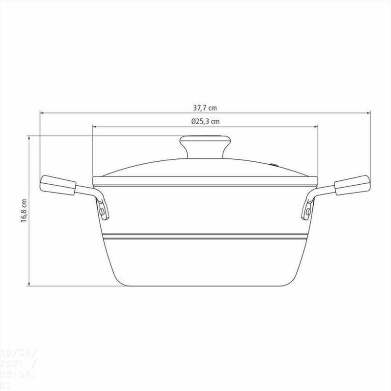 Caçarola Tramontina Sicília Alumínio Antiaderente Starflon Excellent Vermelho 24cm 4,3L Tramontina - A caçarola Tramontina Sicília em alumínio com revestimento interno e externo em antiaderente Starflon Excellent vermelho 24 centímetros de diâmetro 4,3 litros é a escolha perfeita para uso diário e para completar sua cozinha com muito mais cor e estilo. Produzida em alumínio com revestimento antiaderente Starflon Excellent, ela irá garantir maior praticidade e funcionalidade para seu dia a dia, pois os alimentos cozinham de maneira uniforme e não grudam em sua superfície. Suas alças são em baquelite antitérmico e proporcionam um manuseio muito mais confortável e seguro, pois não aquecem. Ela ainda é muito fácil de limpar e pode ser levada à máquina de louças, facilitando suas tarefas e poupando seu tempo na cozinha. A escolha ideal para levar o melhor para sua casa! Orientações Corpo de alumínio com espessura de 3,0 mm que proporciona cozimento rápido e uniforme. Revestimento interno e externo de antiaderente Starflon Excellent que não gruda, é fácil de limpar, mais durável, não é prejudicial a saúde e é livre de PFOA.Tampa de vidro temperado, com saída de vapor e borda de aço inox. Alças e pegador de baquelite antitérmico que oferecem segurança durante o manuseio. Pode ir à máquina de lavar louças facilitando seu dia a dia. Características Gerais EAN13 7891112278349 DUN14 17891112278346 NCM 7615.10.00 1,7300 kg. 1,9800 kg. Metragem 0,011795 m³. 335x 137x 257 mm. 377x 253x 168 mm. Diâmetro 24,0 cm. Capacidade 4,30 l. Espessura 3,0 mm. Cor 1 9E2A2B Hexa Observações A capacidade volumétrica máxima para cozimento é de 3/4 da capacidade total da peça. Posicione as alças do utensílio voltado ao centro do fogão. Em fogões com grade, centralize a peça e alinhe as alças com a grade. Utensílios quentes devem estar fora do alcance das crianças. Este produto não pode sofrer modificações. Antes do primeiro uso, lave com esponja macia, sabão neutro ou detergente líquido. Depois de secar, unte a área interna com óleo ou gordura e leve ao fogo por um ou dois minutos. Deixe esfriar e lave novamente. Seu utensílio Starflon está pronto para uso com ou sem gordura, sempre em fogo baixo ou médio (nunca superior a 260ºC).Para mexer os alimentos use somente utensílios de silicone, nylon ou madeira.Limpeza: Evite a imersão do utensílio quente em água fria.Nunca utilize produtos abrasivos na lavagem. Se deixar queimar alimentos, umedeça a área e reserve até que possa remover os resíduos grudados com esponja e sabão. Para descarte do produto e embalagem siga as orientações de reciclagem vigentes. Este produto não necessita de manutenção, apenas limpeza. Características Gerais do Produto: Garantia: • 1 Ano