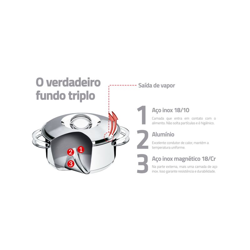 A Caçarola Funda em Aço Inox com Fundo Triplo com Tampa e Alças 24 cm de diâmetro 6,1 L é perfeita para todo o tipo de cozimento. Ela irá tornar a sua cozinha ainda mais completa. A Caçarola Funda da Tramontina é projetada pela linha Solar e oferece praticidade com um design que irá brilhar na mesa na hora de servir, mas não irá brilhar mais que a sua receita. Produzida em aço inox com fundo triplo (aço inox + alumínio + aço inox), ela oferece um cozimento uniforme dos alimentos, além de mantê-los aquecidos por mais tempo. Por sua parte interna ser em aço inox, ela não solta nenhum tipo de resíduo, fazendo com que o sabor seja natural e os alimentos mantenham-se saudáveis. Basta escolher a receita e se aventurar na cozinha.