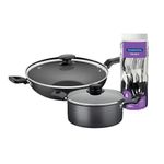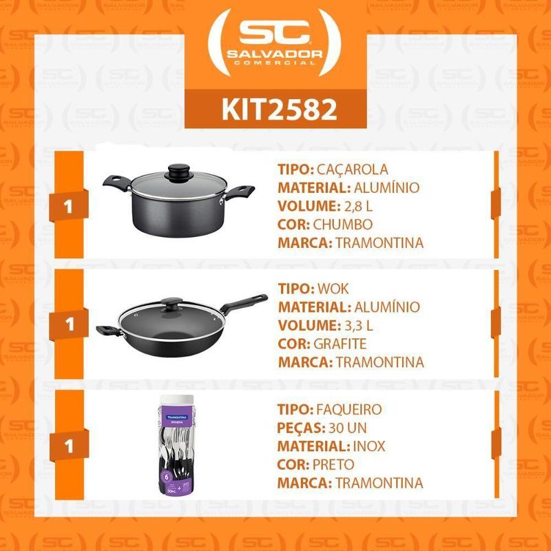 Caçarola Turim Alumínio Antiaderente 2,8l + Faqueiro Ipanema 30pc + Wok Loreto 3,3l - TramontinaMUITO IMPORTANTE:CONFERIR PRODUTOS NO ATO DO RECEBIMENTO. NÃO ACEITAR PRODUTOS COM EMBALAGEM VIOLADA (AMASSADO, RASGADO, ABERTO, QUEBRADO, ETC), A RECUSA DEVE SER FEITA NO ATO Componentes do Kit:1 - Caçarola Turim Alumínio Antiaderente Chumbo 20cm 2,8l Ptc2 - Tramontina1 - Faqueiro Inox 30pc Ipanema Preto - Tramontina1 - Wok Com Cabo Loreto Alumínio Revestimento Antiaderente 28 cm 3,3 l Grafite - Tramontina Caçarola Turim Alumínio Antiaderente 2,8L + Faqueiro Ipanema 30pc + Wok Loreto 3,6L - Tramontina Aprimore sua experiência gastronômica com o Kit Completo Tramontina, a escolha perfeita para quem busca versatilidade no preparo e elegância na mesa. Este conjunto é ideal para cozinheiros domésticos, pois eleva o padrão de suas refeições, tornando o processo mais rápido e agradável. A Caçarola Turim e a Wok Loreto são perfeitas para pratos variados, do ensopado ao salteado, enquanto o Faqueiro Ipanema adiciona um toque de charme. O revestimento antiaderente em todas as panelas garante que os alimentos não grudem, um benefício crucial para cozinhar de forma mais saudável e com menos óleo. A Wok Loreto com seu fundo mais espesso permite um aquecimento uniforme e rápido, otimizando o tempo de cozimento. A Caçarola Turim e a Wok, ambas com revestimento antiaderente Starflon T1, proporcionam uma limpeza incrivelmente fácil, enquanto o Faqueiro Ipanema com lâminas de aço inox oferece resistência e um manuseio confortável. Todo o kit é construído com materiais de alta qualidade, oferecendo a durabilidade e a resistência necessárias para o uso diário. O design inteligente das peças, que otimiza o uso do espaço, torna sua cozinha mais organizada. Não perca a oportunidade de ter mais eficiência e beleza em sua casa. Adquira agora o Kit Tramontina e desfrute do prazer de cozinhar e servir com excelência! Especificações Caçarola:- Capacidade: 2,8L;- Alumínio com 1,2mm de espessura;- Revestimento anti-aderente;- Altura com tampa: 13,5cm;- Altura sem tampa: 9cm;- Altura interna: 8,7cm;- Diâmetro: 20cm;- Comprimento total: 32,5cm;- Garantia de 90 dias para vícios ou defeitos de fabricação;- Não utilizar em temperaturas superiores à 260°C Especificações Faqueiro:- Antes da primeira utilização, lave bem as peças e seque-as.- Produto cortants e perfurantes, tenha cuidado e mantenha sempre fora de alcance das crianças.- Para maior durabilidade dos produtos, recomenda-se secar bem antes de gaurar, mesmo após lavagem em máquinas.- Para descarte dos produtos e embalagem, sega as orientações de reciclagem vigente. Conteudo:6 Faca Lâmina 11,2cm - medida 21cm6 Garfos de mesa. - medida 19cm6 Colheres de mesa. - medida 19cm6 Garfos para sobremesa. - medida 14cm6 Colheres para chá. - medida 14cm Especificações Wok:- Corpo de alumínio com espessura de 1,8 mm que proporciona cozimento rápido e uniforme.- Revestimento interno e externo de antiaderente Starflon Max.- Tampa de vidro temperado com borda de aço inox e saída de vapor.- Cabo e alça de baquelite antitérmico e pegador de nylon que oferecem segurança durante o manuseio.- Pode ir à máquina de lavar louças facilitando seu dia a dia.- Medida do Produto: 13,2cm A x 51,8cm L x 28,4cm P Cor: Cinza | É kit de fábrica: Não | Quantidade de Peças: 32 | Materiais: Alumínio | Adequado para fogão de indução: Não | Com revestimento antiaderente: Sim