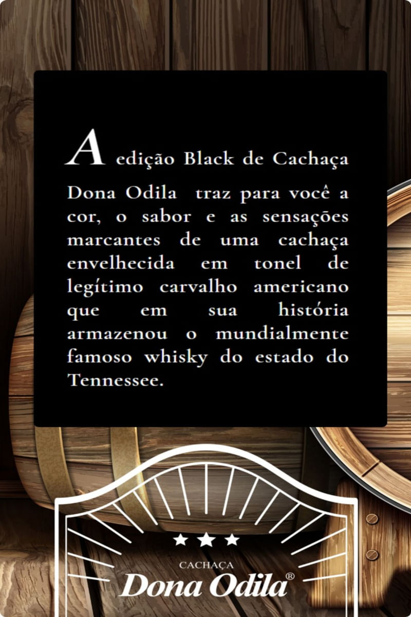 A edição Black de Cachaça Dona Odila traz para você a cor, o sabor e as sensações marcantes de uma cachaça envelhecida em tonel de legítimo carvalho americano que em sua história armazenou o mundialmente famoso whisky do estado do Tennessee.Amor pelasensação!Em meados de 1910 desembarcavam no Brasil imigrantes italianos, entre eles membros das Famílias Pinelli e Basso que se uniriam anos depois.O Sr. Anselmo Basso é o único integrante da Família Basso que se tem registros na história, da família Pinelli se tem notícias apenas do Sr. Gabriel e de um primo, também sem registro de nome.O Sr. Anselmo Basso viveu na região de Cravinhos onde formou uma família com 16 filhos entre eles Odila Basso que em 1952 casou-se com Orvilio Pinelli, filho de Gabriel Pinelli. Desse matrimônio tiveram 5 filhos, 7 netos e 7 bisnetos.Assim começa a história e a inspiração para o nome desta “joia” a cachaça Dona Odila.O nome Dona Odila surgiu da ideia de homenagear a matriarca da família Pinelli, que com muito amor e carinho cuidou de sua família.Símbolo de conforto, carinho e segurança, esse nome marcante e único, é traduzido para os produtos Dona Odila com suavidade sem perder a originalidade de seu sabor.Os produtos Dona Odila são produzidos com todo amor, primando sempre pela qualidade e originalidade com toques caseiros e segredos de família resultando em um sabor único que só a Dona Odila poderia guardar por tantos anos e me escolher seu neto Carlos Eduardo Pinelli para passar ideias e sabores milenares guardados até então a 7 chaves.