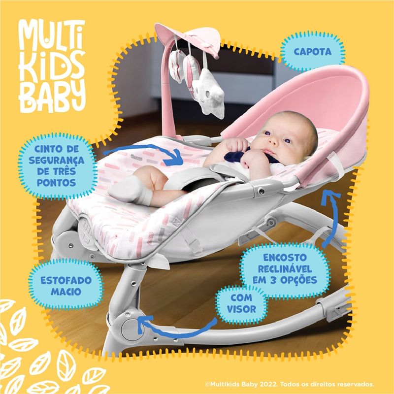 Cadeira de Descanso e Balanço Spice - Multikids BabyA Cadeira de Descanso e Balanço Spice entretém, relaxa e estimula o bebê desde o nascimento até os 18 kg. Ela vibra, tem canções de ninar e brinquedos. Assim, você consegue um tempinho para organizar os cuidados do bebê. Cadeira de Descanso e Balanço Spice: seu bebê feliz, tranquilidade para você• 2 em 1: balanço e descanso;• 3 brinquedos que estimulam o desenvolvimento do bebê;• Estrutura dobrável: ocupa pouco espaço quando fechada;• 10 canções de ninar;• 5 sons da natureza;• Volume ajustável;• 1 intensidade de vibração (para de vibrar após 10 minutos);• Encosto reclinável em 3 posições;• Capota de proteção; • Cinto de segurança de três pontos;• Estofado macio.A felicidade do seu bebê é a sua felicidade!Por isso, veja tudo que a Cadeira Spice oferece:Segurança e confortoA Cadeira de Descanso e Balanço Spice conta com um tecido macio para garantir a tranquilidade e o conforto do seu bebê enquanto ele se diverte. Além de priorizar a segurança com o cinto de 3 pontos e a capota de proteção contra vento e sol.Estímulo, entretenimento e diversãoPara estimular o desenvolvimento do bebê, ela conta com 3 brinquedos e músicas. São 10 canções de ninar, 5 sons da natureza e volume ajustável para cada momento.Distração e relaxamento para seu bebêO momento de relaxar está garantido com uma intensidade de vibração e muita tranquilidade. Possui também 3 regulagens do encosto.Dobrável e portátilFácil de levar e armazenar onde você estiver. Ela é dobrável para se encaixar em qualquer cantinho.Disponível em 2 coresDesign moderno e estampas suaves. A cadeira está disponível em duas cores diferentes. Atenção: informações importantesO que são produtos remanufaturados? São produtos originais de fábrica que podem conter algum tipo de avaria. Os produtos remanufaturados podem não acompanhar os acessórios, mas isso não impacta no funcionamento. Estas avarias são apenas de aparência, que não afetam a funcionalidade e uso. Produto remanufaturado com garantia de 90 dias para vícios ocultos. Não cobrimos eventuais danos estéticos.