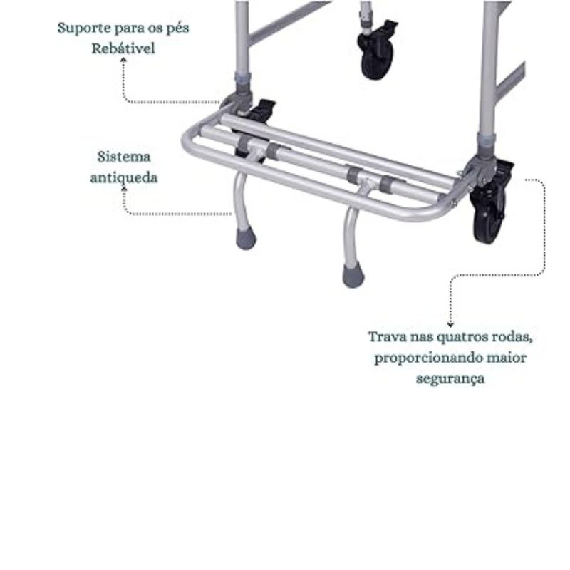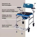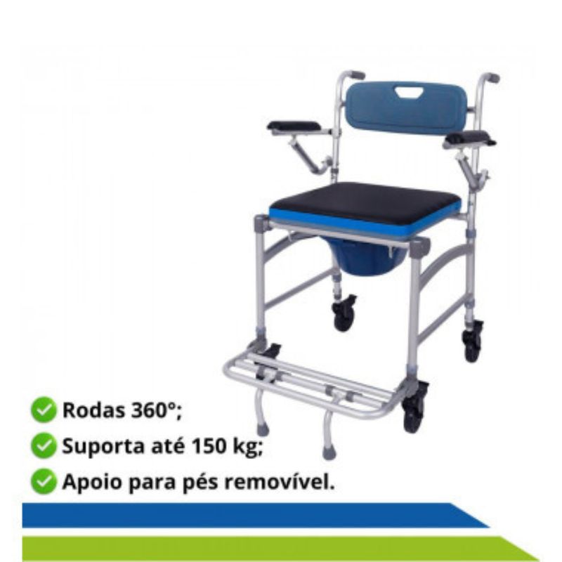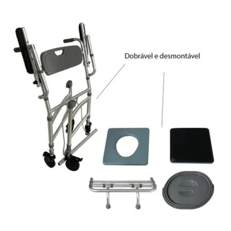 Cadeira Banho Alumínio 150kg DesmontávelSC102Indicada para facilitar a higienização e servir de apoio durante as necessidades fisiológicas, de pessoas com déficit de equilíbrio, fraqueza muscular ou grande perda na mobilidade.TamanhosComposiçãoTubo estrutural e Apoio para os pés em alumínio; Assento, Encosto e Balde em polietileno; Rodas e Manopla em Policloreto de Vinila (PVC); Apoios para os braços em Poliuretano (PU).PrecauçõesFaça manutenções periódicas para manter a segurança da cadeira de banho, incluindo a verificação das rodas. Realize inspeções regulares quanto a danos antes de utilizá-la. Se algum dano for encontrado, NÃO use o produto. Caso contrário, podem ocorrer ferimentos. Mantenha os pinos de segurança lubrificados para que funcionem corretamente.Condições de armazenamentoManter em local protegido de chuva, umidade e luz direta. Preferencialmente armazenar o produto em sua embalagem original.Condições de manipulaçãoHigienize a cadeira de banho regularmente com água e sabão neutro. Não utilize produtos de limpeza abrasivos. Deixe o produto secar completamente entre os usos.Peso suportado150 kg