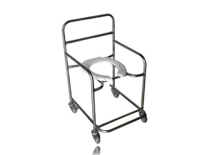 CÓDIGO : FM 6081 ITEM : CADEIRA DE BANHO OBESO INOXIDAVEL C/RDZ 3” GALV FREIO DIAGONAL Estrutura tubolar de 22,22mm de diâmetro, totalmente inoxidável e reforçada, com rodízios giratórios de 3” de diâmetro, sendo 2 com freios, largura interna 0,48 mt e externa 0,55 mt, assento sanitário com altura de 0,53 mt e altura total do encosto 0,92 mt. Suporta até 120 quilos