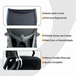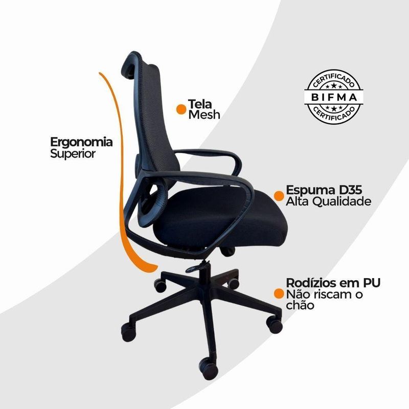 Cadeira De Escritório Diretor Oficial Verona Sem ApoioCadeira Presidente Oficial Comfort Verona sem Apoio de NucaDesign ergonômico, conforto inteligente e estilo profissional.Projetada para quem exige conforto e postura durante longas horas de trabalho, a Cadeira Comfort Verona entrega ergonomia de ponta, materiais de qualidade e visual moderno.O encosto é revestido em tecido Mesh Premium, composto por 64% de poli elastômero e 36% de poliéster. Já o assento conta com espuma 35D, revestida em tecido 100% poliéster.Atende aos requisitos da NR-17. Além disso, possui o cobiçado selo BIFMA de qualidade, garantindo durabilidade e desempenho excepcionais!Garantia de 2 anos!Diferenciais do Produto:Encosto com curvatura em “S” – Segue a anatomia da coluna, oferecendo suporte lombar natural.Apoio de braços fixos – Em PP virgem com fibra de vidro, alta resistência e acabamento sofisticado.Assento anatômico – Espuma moldada de alta resiliênciaMecanismo butterfly – Curso médio de 25 mm, flexível e confiável.Pistão a gás preto #85 – Curso de 40 mm para ajuste de altura suave.Base em nylon Ø 320 mm – Leve, resistente com fibra de vidro.Rodízios de nylon Ø 55 mm – Movimentação fluida e silenciosa.Extras: acompanha e-book exclusivo.Dimensões Aproximadas:Altura total: 100 a 110 cmAltura do assento até o chão: 34 a 50 cmLargura entre braços: 59 cmLargura do assento: 49 cmProfundidade do assento: 51 cmAltura dos braços: 28 cmDistância entre os pés: 67 cmIdeal para home office, escritórios executivos ou salas de reunião, a Comfort Verona une ergonomia, leveza e elegância em uma só cadeira.Conforto e produtividade ao seu alcance com a Comfort Verona.