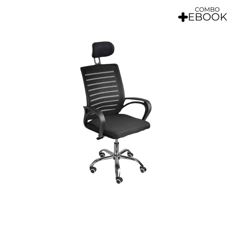 Cadeira De Escritório Diretor Roma Oficial Apoio + E-book 1 UnidadeCadeira de Escritório Secretaria Diretor Roma – Ergonomia, Conforto e Mobilidade para o Seu Dia a DiaA Cadeira Secretaria Diretor Roma foi desenvolvida para oferecer conforto, funcionalidade e design moderno em qualquer ambiente. Ideal para escritório, home office ou estudo, ela garante bem-estar durante longas horas de uso, prevenindo desconfortos e promovendo uma postura correta.Com encosto em tela Mesh respirável, estrutura reforçada e base cromada, a Roma une leveza, resistência e elegância. Seu ajuste de altura permite personalizar a posição ideal em relação à mesa, tornando a rotina mais ergonômica e produtiva.Os apoios de braço proporcionam sustentação aos ombros e antebraços, favorecendo uma postura natural e confortável, enquanto as rodas e o sistema giratório de 360º oferecem liberdade total de movimento sem esforço. Diferenciais do ProdutoErgonomia e Conforto: Proporciona apoio ideal à coluna e aos braços, reduzindo a fadiga.Tela Mesh Respirável: Mantém o frescor e o conforto térmico durante o uso prolongado.Ajuste de Altura: Adapta-se perfeitamente à altura da mesa e às suas preferências pessoais.Função Giratória e Rodízios: Mobilidade suave e prática em qualquer ambiente.Design Moderno: Visual elegante que combina com escritórios e home offices.Montagem Simples: Acompanha manual de instruções e suporte pós-venda especializado.Extras: acompanha e-book exclusivo. Especificações TécnicasModelo: RomaMarca: Oficial WebshopTipo de Cadeira: Secretaria / DiretorMaterial da Estrutura: Nylon e Aço CromadoRevestimento: Tela Mesh (Nylon)Assento: Madeira multilaminada com espuma de alta densidadeBraços: Polipropileno (PP) fixosPeso Máximo Suportado: 120 kgPeso da Cadeira: 5,5 kg Dimensões do ProdutoAltura Total: 85 cmAltura do Encosto: 45,5 cmAltura do Assento (do chão): 43 cmLargura do Assento: 48,5 cmProfundidade do Assento: 48,5 cmLargura entre Braços: 54 cm Cuidados e ManutençãoA limpeza pode ser feita com pano úmido e detergente neutro.Evite produtos abrasivos e exposição prolongada ao sol para preservar o brilho e a integridade dos materiais.Conforto, praticidade e elegância em um só produto!A Cadeira Secretaria Diretor Roma é a escolha ideal para quem busca ergonomia, mobilidade e um toque sofisticado no ambiente de trabalho ou estudo.