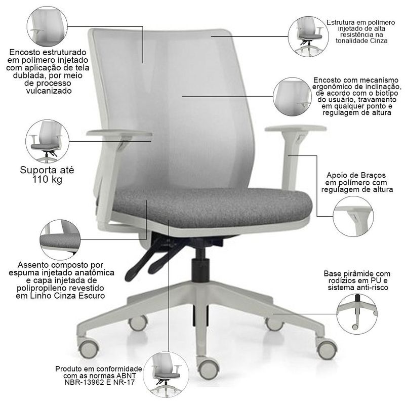 A Cadeira de Escritório Flow, da Lyam Decor, é a perfeita combinação entre estilo e funcionalidade, ideal para quem busca conforto nas longas horas de trabalho. Com um design moderno e ergonômico, essa cadeira giratória se adapta perfeitamente ao seu biotipo, oferecendo regulagem de altura do assento, encosto e braços. O mecanismo de contato intuitivo permite ajustes precisos, garantindo que cada usuário encontre a posição ideal para manter a produtividade e o bem-estar. Sua base em pirâmide não é apenas elegante, mas também prática, pois conta com rodízios em PU que deslizam suavemente pelo chão, enquanto o sistema anti-risco protege seus pisos contra danos indesejados. Seja no escritório ou em um home office aconchegante, a cadeira diretor Flow transforma qualquer ambiente em um espaço de trabalho ou estudos sofisticado e confortável. Sente-se, ajuste e flua na sua produtividade! Dimensões da Cadeira (L x A x P) 71 x 81 x 71 cm Medidas Internas: Altura máxima regulável: até 93 cm Altura regulável do chão ao assento: 40,5 a 53 cm Altura do chão aos braços: 60 a 71,5 cm Assento livre (L x P): 47,5 x 47 cm Encosto (L x A): 45 x 47 cm Características: Estrutura em polímero injetado de alta resistência na tonalidade Cinza. Assento estruturado em compensado multilaminado e estofado com espuma injetada anatômica, com acabamento feito por capa injetada de polipropileno. Revestimento em tecido Linho de alta qualidade na tonalidade Cinza Escuro. Encosto estruturado em polímero injetado com aplicação de tela dublada, por meio de processo vulcanizado. Encosto com mecanismo ergonômico de inclinação, de acordo com o biotipo do usuário, travamento em qualquer ponto e regulagem de altura. Braços em polímero com regulagem de altura. Base pirâmide com rodízios em PU e sistema anti-risco. Peso máximo suportado 110 kg, com uso recomendado de 8 horas diária. Produto em conformidade com as normas ABNT NBR-13962 E NR-17. - Por se tratar de estofado as medidas podem ter uma pequena variação de até 3 cm. - A tonalidade do produto real poderá ter ligeira variação devido o lote de tecidos. Observações importantes: - Produto para uso residencial em ambiente interno, não devendo ficar exposto diretamente ao sol, calor e umidade excessivos. - Pode haver alguma diferença de tonalidade entre a imagem e o produto real, por conta do tratamento de imagens e a calibração de cores do seu monitor. - As imagens são meramente ilustrativas, não acompanham objetos de decoração e eletrônicos. - Ao receber a mercadoria, o cliente deve verificar as condições da embalagem, caso haja alguma avaria não assine o comprovante de recebimento e entre em contato com nossa loja para orientações. - Montagem, desmontagem e outras instalações serão de responsabilidade do cliente. Não nos responsabilizamos, no ato da entrega, por subir escadas/elevadores ou pelo transporte por guincho em apartamentos. Eventuais despesas são de responsabilidade do comprador. - Confira as dimensões do produto e certifique-se de que passará normalmente por supostos elevadores, portas, escadas e/ou corredores de sua residência. - Para mais informações, acesse nossa Central de Atendimento.