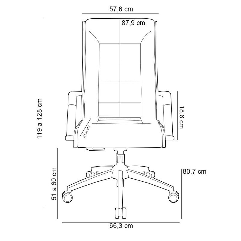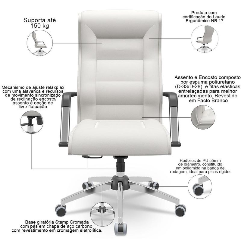 Eleve o seu escritório a um novo patamar com a Cadeira Presidente Giratória Kirk, da Lyam Decor. Projetada para quem busca o equilíbrio perfeito entre estilo e funcionalidade, a essa cadeira de escritório é a escolha ideal para líderes que valorizam a sofisticação e o conforto. Com um design imponente e elegante, ela se adapta a diversos ambientes, desde escritórios corporativos até home offices, isso porque cada detalhe foi desenvolvido para garantir a melhor experiência. A começar pela base cromada e pelo mecanismo Relax, os quais oferecem um visual moderno, além de um ajuste preciso da altura e inclinação do encosto. Já o assento e encosto tapeçados com espumas de alta densidade proporcionam o máximo de conforto, mesmo durante longas horas de trabalho ou estudos. Por fim, os rodízios PU permitem uma mobilidade suave e silenciosa, assim como otimizam a dinâmica no ambiente. Enfim, para um escritório mais profissional e sofisticado, a cadeira giratória Kirk é a escolha certa. Adicione ao seu carrinho e surpreenda-se! Dimensões da Cadeira (L x A x P) 66,3 x 119 x 80,7 cm Medidas Internas: Altura total ajustável: de 119 a 128 cm Altura total do encosto: 87,9 cm Largura do encosto: 57,6 cm Profundidade do assento: 51,2 cm Altura do chão ao assento ajustável: de 51 a 60 cm Altura do braço: 18,6 cm Características: Estrutura do assento e encosto unificados tipo concha composto por madeira 18mm, espuma de poliuretano (D-33/D-28) e fitas elásticas entrelaçadas para melhor amortecimento. Revestimento em tecido Facto de alta qualidade na tonalidade Branco. Base giratória Stamp Cromada, com pás em chapa de aço carbono com revestimento em cromagem eletrolítica. Rodízios de PU 55mm de diâmetro, constituído em poliamida (PA) na região central e em poliuretano (PU) na banda de rodagem, ideal para pisos rígidos. Mecanismo de ajuste relaxplax com uma alavanca e recursos de movimento sincronizado de reclinação encosto/assento e opção de livre flutuação. Peso máximo suportado 150 kg. Produto com certificação do Laudo Ergonômico NR 17 - Por se tratar de estofado as medidas podem ter uma pequena variação de até 3 cm. - A tonalidade do produto real poderá ter ligeira variação devido o lote de tecidos. Observações importantes: - Produto para uso residencial em ambiente interno, não devendo ficar exposto diretamente ao sol, calor e umidade excessivos. - Pode haver alguma diferença de tonalidade entre a imagem e o produto real, por conta do tratamento de imagens e a calibração de cores do seu monitor. - As imagens são meramente ilustrativas, não acompanham objetos de decoração e eletrônicos. - Ao receber a mercadoria, o cliente deve verificar as condições da embalagem, caso haja alguma avaria não assine o comprovante de recebimento e entre em contato com nossa loja para orientações. - Montagem, desmontagem e outras instalações serão de responsabilidade do cliente. Não nos responsabilizamos, no ato da entrega, por subir escadas/elevadores ou pelo transporte por guincho em apartamentos. Eventuais despesas são de responsabilidade do comprador. - Confira as dimensões do produto e certifique-se de que passará normalmente por supostos elevadores, portas, escadas e/ou corredores de sua residência. - Para mais informações, acesse nossa Central de Atendimento.
