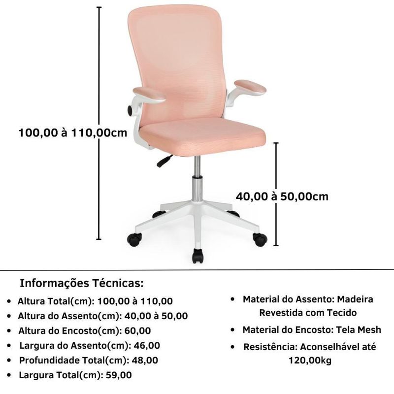 Cadeira De Escritório Mônaco Base Giratória - RosaCadeira de Escritório Mônaco Base GiratóriaEleve sua experiência de trabalho com a Cadeira de Escritório Mônaco. Com linhas elegantes e acabamento refinado, a Cadeira de Escritório Mônaco adiciona um toque de profissionalismo e modernidade ao seu espaço de trabalho. Seja em um escritório ou em casa, esta cadeira se destaca como um elemento de estilo!A possibilidade de ajustar a altura da cadeira permite personalizar a posição de trabalho de acordo com suas necessidades. Seja em uma mesa tradicional ou em um ambiente de trabalho mais moderno, a Cadeira de Escritório Mônaco oferece versatilidade para atender às suas preferências.O encosto em tela mesh não apenas adiciona um toque contemporâneo ao design, mas também proporciona uma ventilação eficiente. Isso mantém você fresco e confortável durante todo o dia, enquanto a tela ível se adapta dinamicamente aos contornos do seu corpo.Construída com materiais de alta qualidade, esta cadeira oferece durabilidade e estabilidade. Seu assento é feito em madeira e revestido em tecido, já a sua estrutura é feita em metal, materiais resistentes que garantem uma longa vida útil ao produto.Dimensões:> Material do Assento: Madeira Revestida com Tecido> Material do Encosto: Tela Mesh> Resistência: Aconselhável até 120,00kg> Peso: Aproximadamente 8,00kgEspecificações Técnicas:> Altura Total(cm): 100,00 à 110,00> Altura do Assento(cm): 40,00 à 50,00> Altura do Encosto(cm): 60,00> Largura do Encosto(cm): 45,00> Profundidade do Assento(cm): 46,00> Largura do Assento(cm): 46,00> Espessura do Braço(cm): 7,00> Profundidade Total(cm): 48,00> Largura Total(cm): 59,00Importante: Produto enviado desmontado acondicionado em caixa de papelão reforçada, acompanha manual de montagem (não nos responsabilizamos pela montagem do produto).> Observações de : Os entregadores não são autorizados:> Entrar no domicílio, sem estar acompanhado pelo cliente;> Entrar ou subir desacompanhado em prédio residencial ou comercial, o cliente precisa receber o pedido na portaria;> Entregar por meios alternativos (exemplo: içar produto por janela, subir escadas);> Entregar em edifícios, será realizada apenas na portaria;> Realizar montagens, instalação ou manutenção de produtos;> Abrir a embalagem do produto;> Realizar em diferente do que consta na ;> Garantia: 03 Meses Contra de Fabricação.> Marca: Magazine Decor Profundidade Montado: 48 | Largura Montado: 59 | Altura Montado: 110 | Tonalidade: Rosa | Altura: 110 | Produto: Cadeira de Escritório Mônaco | Largura: 59 | Material da Estrutura: Metal | Cor: Rosa | Peso do Produto: 8 | Estado de Origem: SC | Material para Filtro: Tela Mesh | Largura do Produto (cm): 59 | Peso do Produto (Kg): 8 | Comprimento do Produto (cm): 48 | Altura do Produto (cm): 110 | Fabricante: Magazine Decor | Acompanha Almofada: Não | Garantia do Fabricante: 3 | Profundidade: 48 | Comprimento do Produto: 48 | Cômodo Indicado: Escritórios | Possui Pistão: Sim | Acompanha Braço: Sim | Altura do Produto com Embalagem (cm): 55 | Largura Produto Com Embalagem (cm): 30 | Comprimento Produto Com Embalagem (cm): 55 | Peso Produto Com Embalagem (Kg): 9 | Conteúdo da Embalagem: 1 Cadeira | Descrição do Tamanho: 110x59x48 | Necessita Montagem: Sim | Instruções/Cuidados: Não Limpar com Materiais Abrasivos | Nome do Simples no Fornecedor: Cadeira de Escritório Mônaco