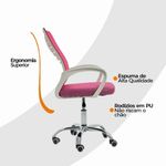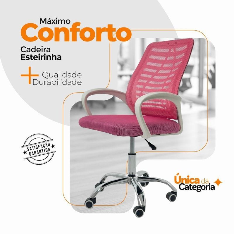 Cadeira De Escritório Oficial Esteirinha Mesh Giratória RosaCadeira de Escritório Esteirinha Tela Mesh – Conforto, Leveza e Ergonomia para o Dia a DiaA Cadeira Esteirinha Tela Mesh foi desenvolvida para oferecer praticidade, ventilação e conforto para quem passa longas horas sentado. Com design leve, estrutura funcional e recursos essenciais de ergonomia, ela é ideal para escritórios, home office e ambientes de estudo que exigem mobilidade e bem-estar.Seu encosto em tela Mesh respirável garante excelente circulação de ar, reduzindo o acúmulo de calor durante o uso prolongado. O assento possui estrutura resistente em madeira multilaminada e revestimento confortável para tornar sua rotina mais agradável.Com ajuste de altura, sistema giratório e rodízios de movimentação suave, a Esteirinha oferece a versatilidade que o seu dia a dia precisa, ao mesmo tempo em que os apoios de braço fixos contribuem para uma postura mais estável e confortável.Disponível nas cores preta e branca, para combinar com diferentes estilos de ambiente. Conforto, Mobilidade e Ergonomia EssencialEncosto em tela Mesh respirável, proporcionando ventilação contínua.Assento com estrutura resistente e formato ergonômico para maior conforto ao longo do dia.Apoios de braço fixos que auxiliam na postura durante reuniões, atividades de escrita e uso de computador.Sistema giratório com rotação de 360º, oferecendo liberdade de movimento.Regulagem de altura que permite ajustar a postura ideal de acordo com sua mesa de trabalho.Rodízios resistentes e silenciosos, garantindo deslocamento suave no ambiente.Acompanha e-book exclusivo como material adicional. Medidas do ProdutoAlturaTotal: 89–97 cmAssento ao chão: 58–67 cmAltura do encosto: 51 cmAltura do braço: 23 cmLarguraBase 1 perna: 25 cmBase 2 pernas: 50 cmEncosto: 47 cmAssento: 46 cmDistância entre braços: 61 cmLargura do braço: 5 cmComprimentoEspessura do encosto: 2 cmAssento: 45,5 cmBraço: 32 cm Informações TécnicasPeso: 5 kgEstrutura: Nylon e aço cromadoRevestimento: Nylon e tela MeshBraços: PolipropilenoAssento: Madeira multilaminadaPeso máximo suportado: 120 kgCores disponíveis: Preto e Branco Leveza, Funcionalidade e Conforto ao Seu AlcanceA Cadeira Esteirinha Tela Mesh é a escolha ideal para quem busca uma cadeira prática, arejada e confortável para uso diário.Combinando mobilidade, ergonomia e um design versátil, ela se adapta facilmente a diferentes ambientes — sempre entregando bem-estar e desempenho.